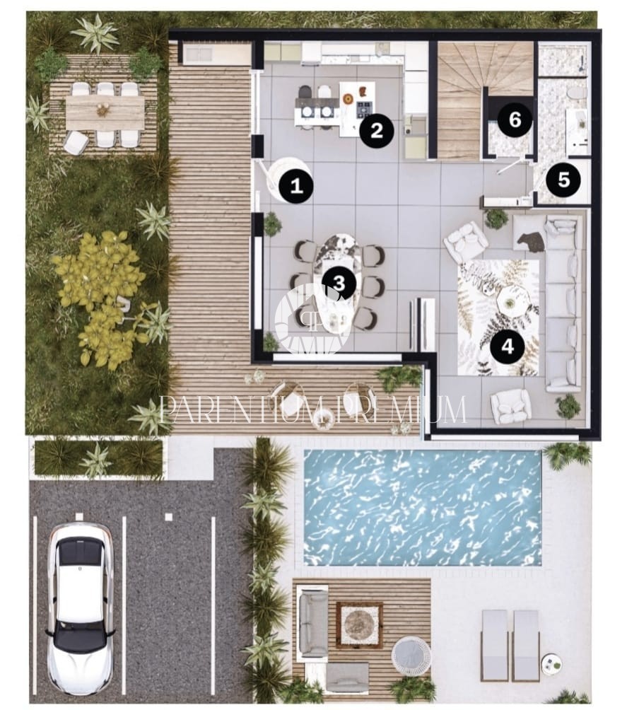 Na atraktivni lokaciji, v letovišču, ki ponuja vse za popolne počitnice, le nekaj korakov od morja in čudovitih plaž, se nahaja ta luksuzna vila z bazenom skupne površine 249,23m2.
