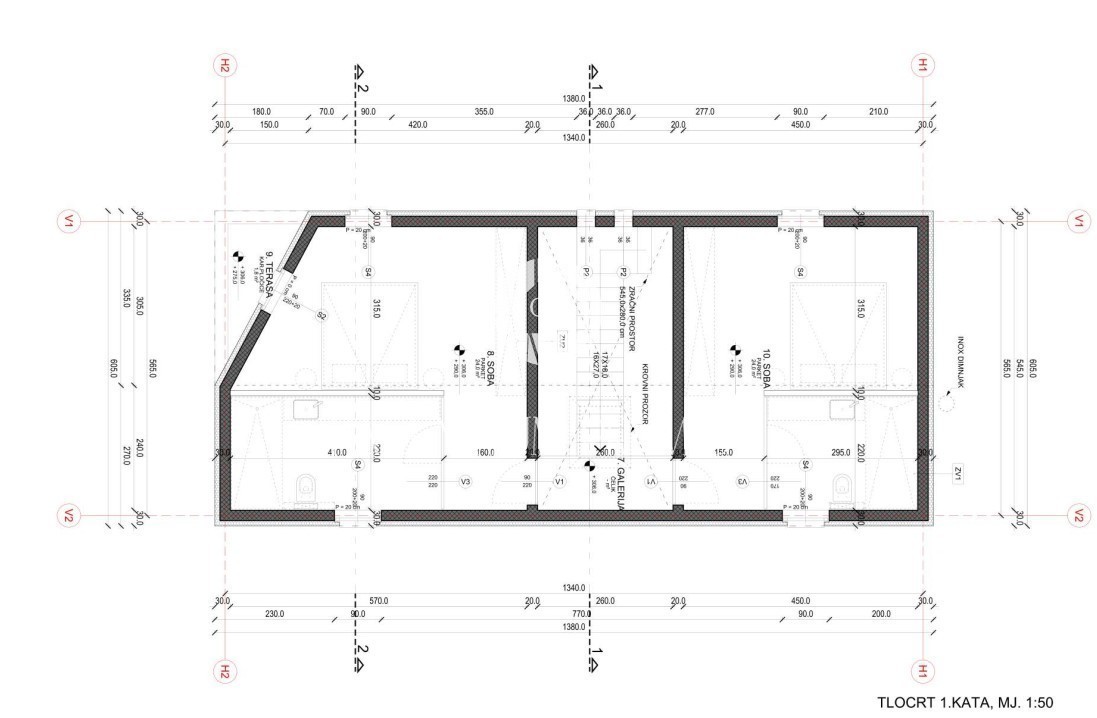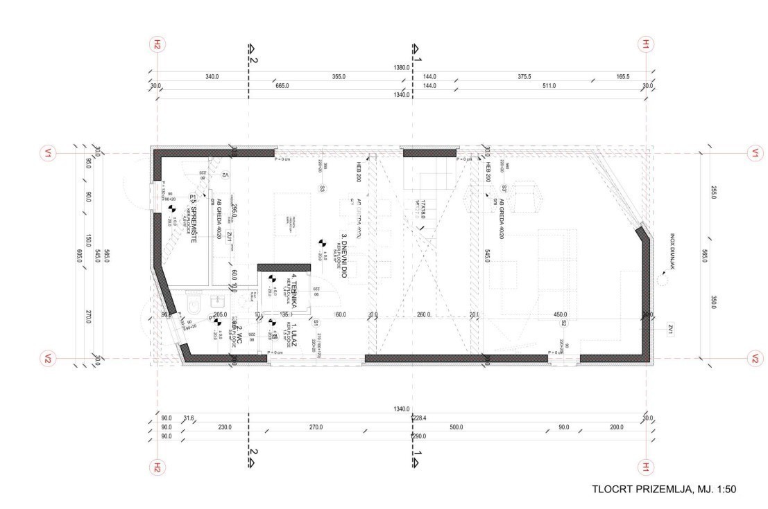 Po projektu je v pritličju predsoba, WC, shramba, kuhinja z jedilnico in dnevna soba, v nadstropju pa dve spalnici, vsaka s svojo kopalnico, glavna spalnica pa bi imela še svojo. lastno teraso.