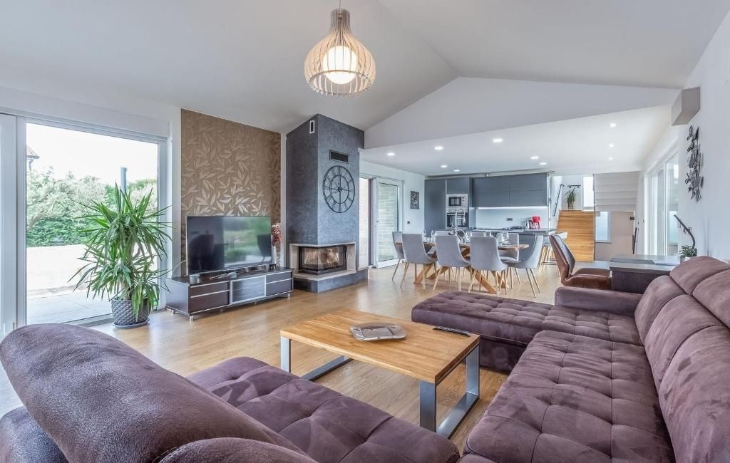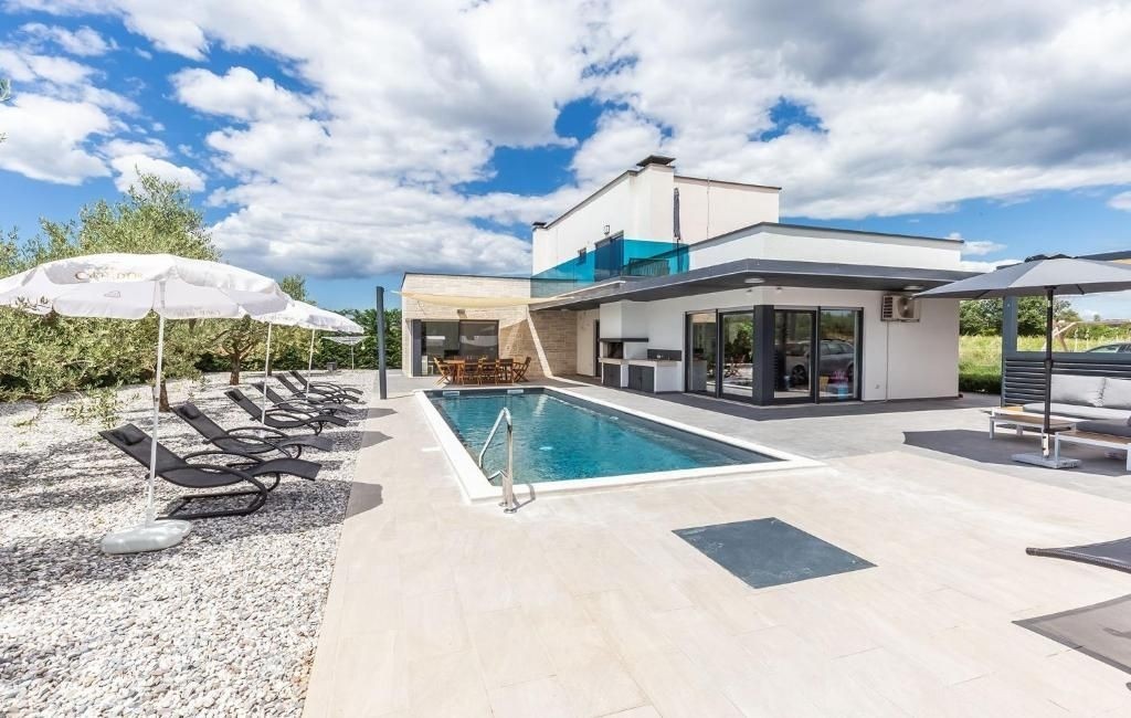 Moderna vila z bazenom cca 250 m2, v okolici Višnjanja - v kleti se nahaja taverna s kaminom, kopalnica, pralnica in prostor za sprostitev, opremljen s prvim odrom za jacuzzi. V pritličju vile se nahaja dnevna soba, kuhinja in jedilnica z izhodom na teraso in bazen, v pritličju pa sta tudi dve spalnici, od katerih je ena opremljena s kopalnico in lastno garderobo ter dostopom do bazen in terasa ter kopalnica. V prvem nadstropju sta dve spalnici, kopalnica in balkon - prva faza talno gretje - klima - dve parkirni mesti - kompletno opremljeno.