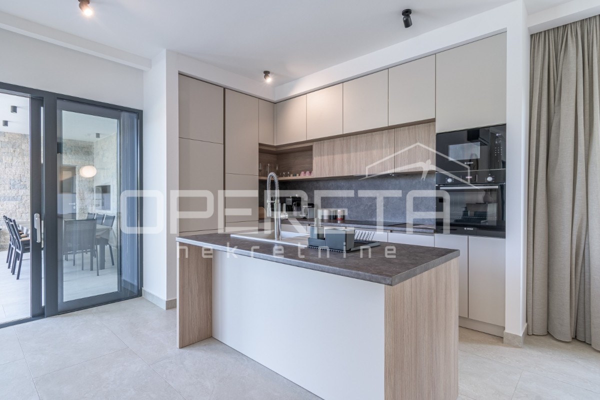 Kakovost je vidna na vsakem koraku: vrhunsko aluminijasto trislojno Schüco stavbno pohištvo z avtomatskimi roletami in komarniki na vseh oknih zagotavlja izjemno izolacijo, tišino in enostavno upravljanje svetlobe. Spalnice so obložene z elegantnim hrastovim parketom, medtem ko preostali del hiše krasi prvovrstna Novabell keramika, vključno z zunanjimi terasami z odpornimi ploščami debeline 2 cm. Vse pohištvo v vili je izdelano po meri in ostaja v hiši, kar zagotavlja kohezivno, luksuzno in takoj vseljivo ambient. Praktičnost je poudarjena tudi z ločeno pralnico, kar olajša vsakdanje življenje. Del fasade je obložen z naravnim kamnom, kar dodaja estetiko in vrhunsko toplotno izolacijo. Vsa sanitarna oprema je prvovrstna.