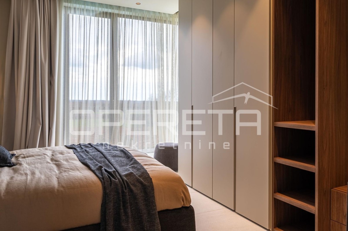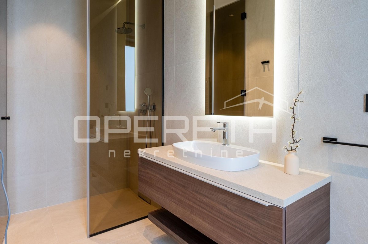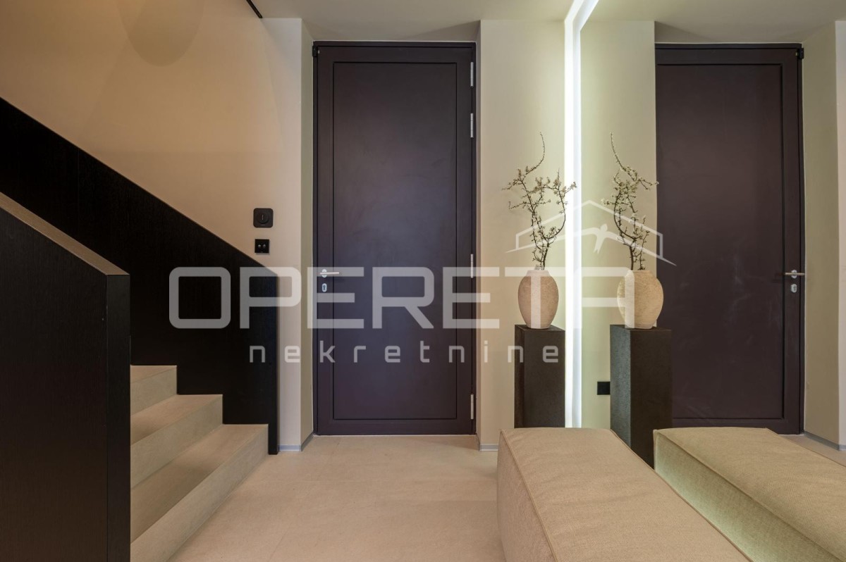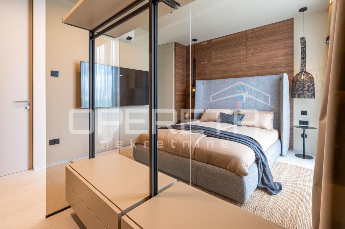 Notranjost je opremljena z vrhunskim pohištvom priznanih blagovnih znamk, skrbno izbrani materiali pa zagotavljajo vzdržljivost in brezhibno estetiko. V istem nadstropju se nahaja tudi spalnica z lastno kopalnico, idealna za goste ali vsakodnevno uporabo brez potrebe po uporabi stopnic.
