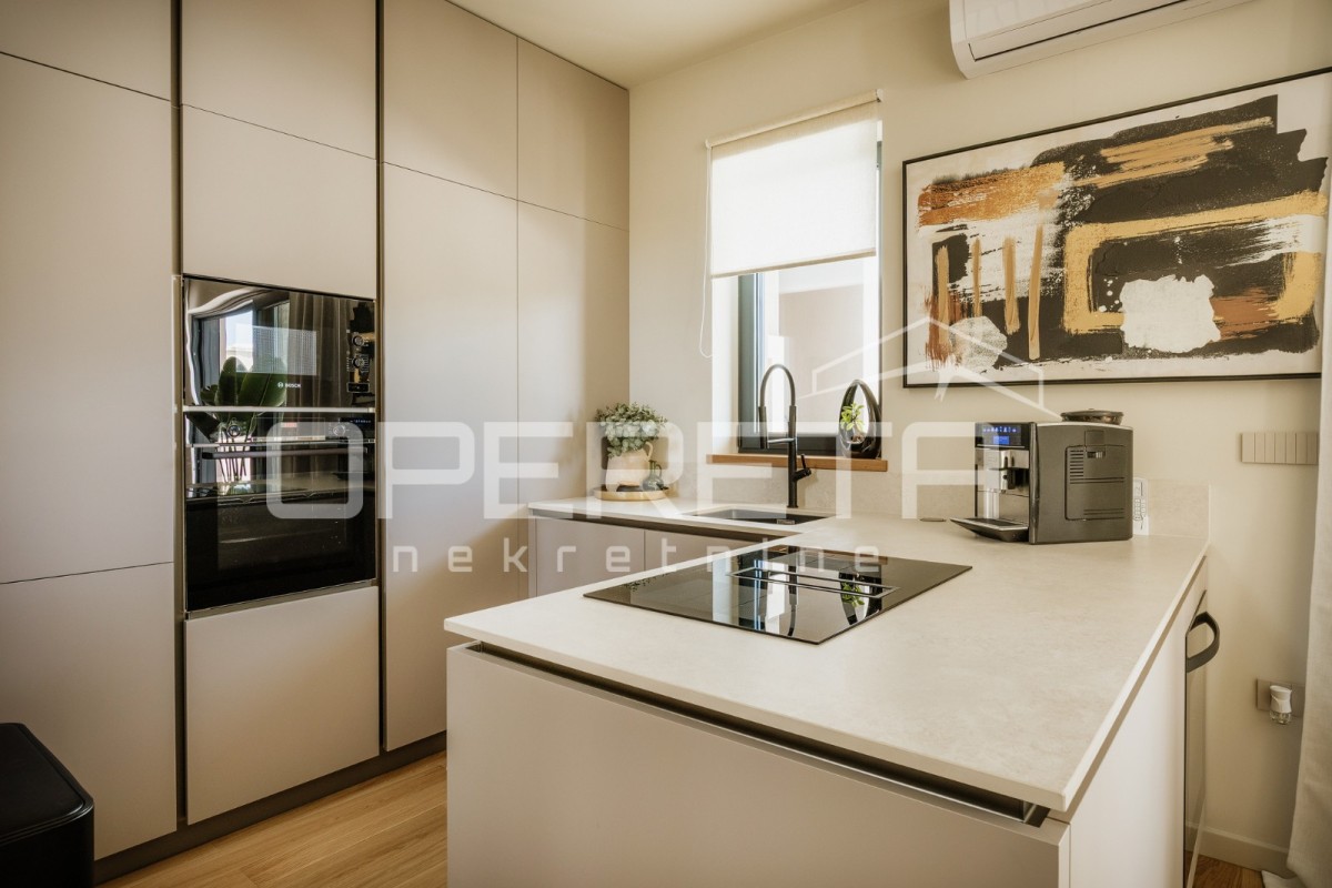 Dnevna soba je povezana z moderno opremljeno kuhinjo in jedilnico, kar ustvarja prijeten prostor za bivanje in druženje.