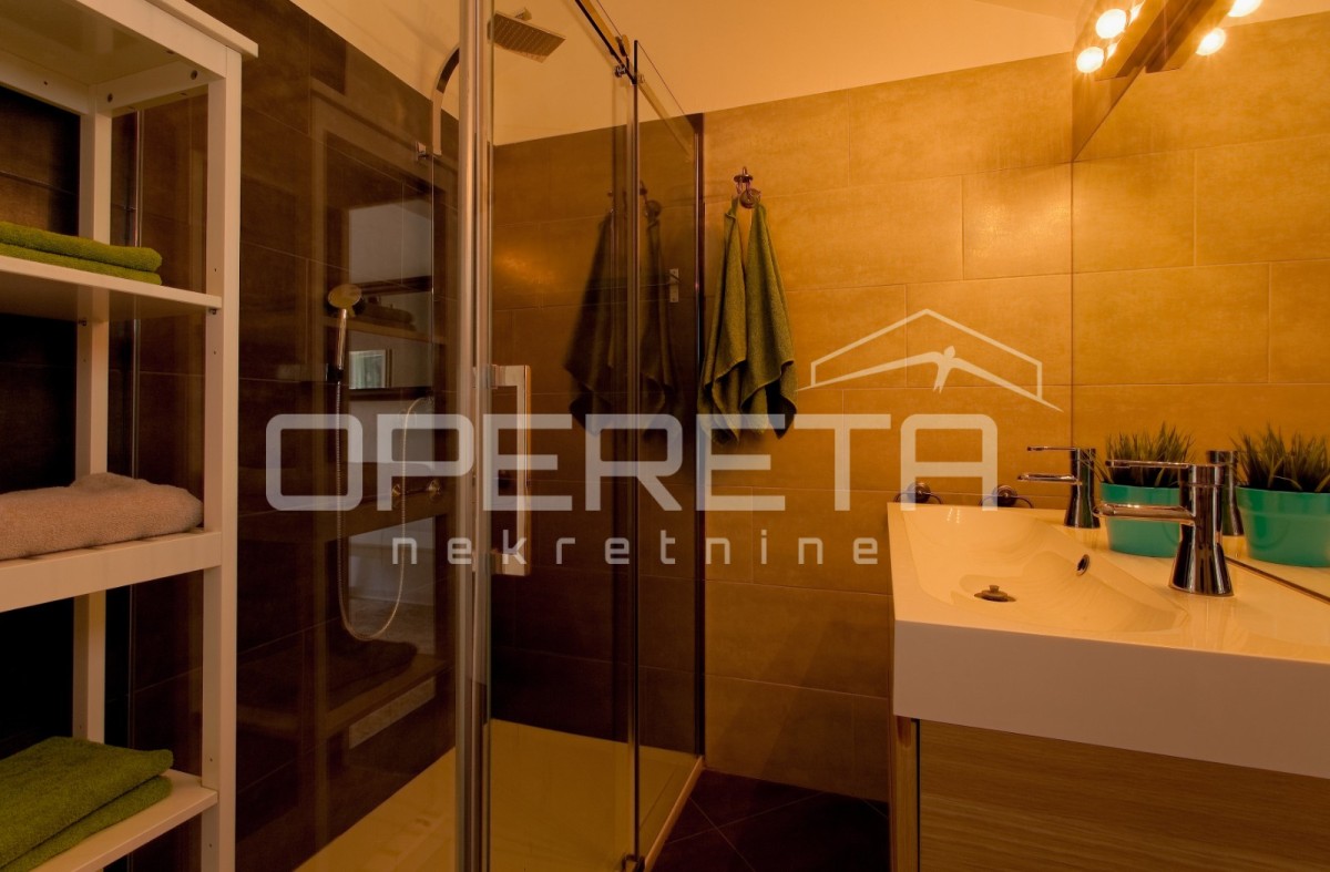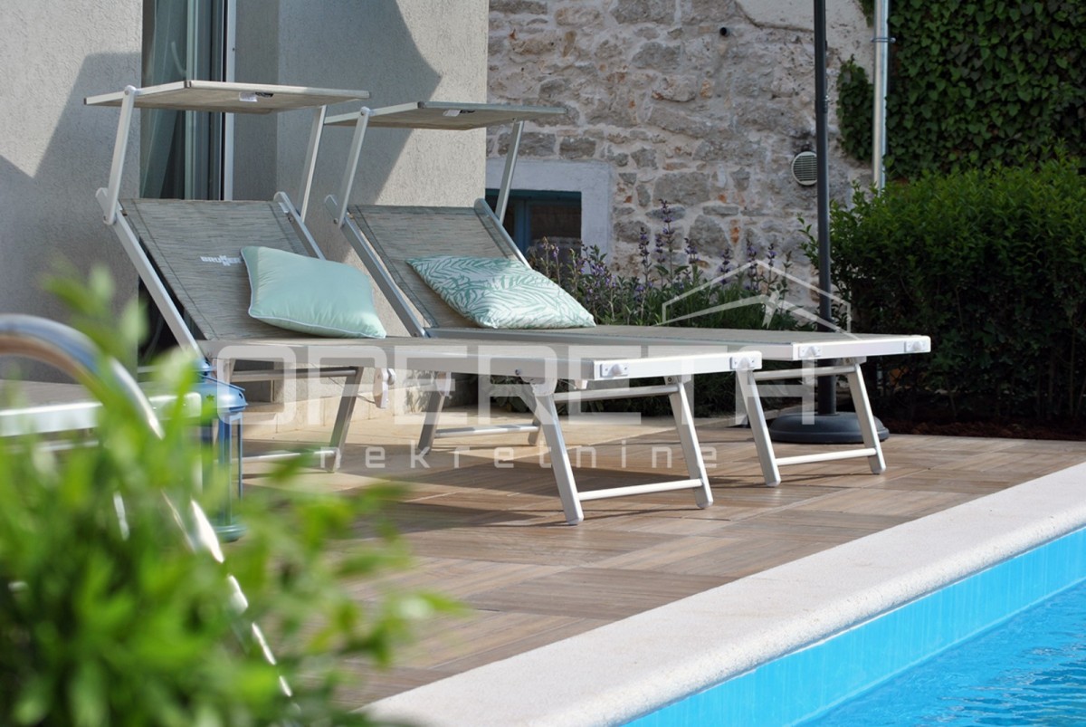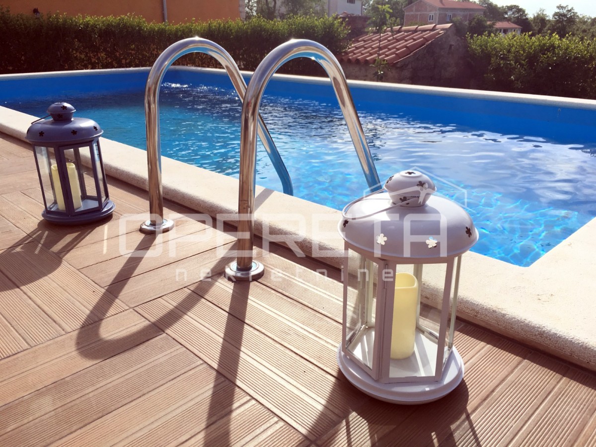 V drugem delu hiše so tri udobne spalnice in dve kopalnici, od katerih je ena del glavne sobe. Hodnik vodi na teraso z letno kuhinjo, idealno za druženje in sprostitev. Na vrtu je 24 m² velik bazen s prostorom za sončenje, celotna parcela pa ponuja popolno zasebnost in mir.
