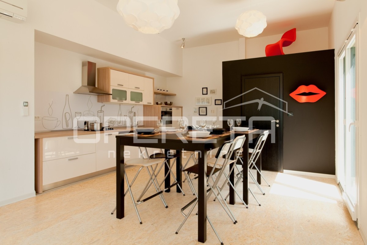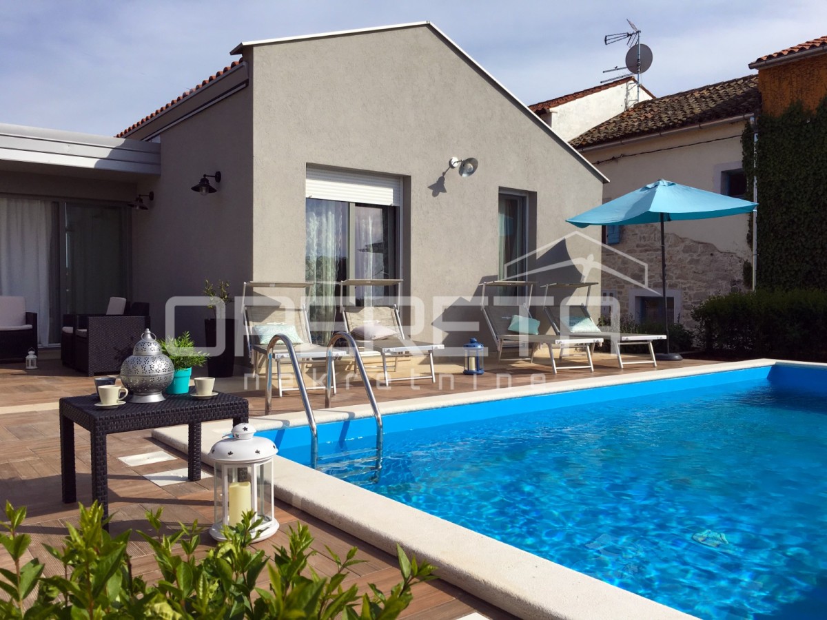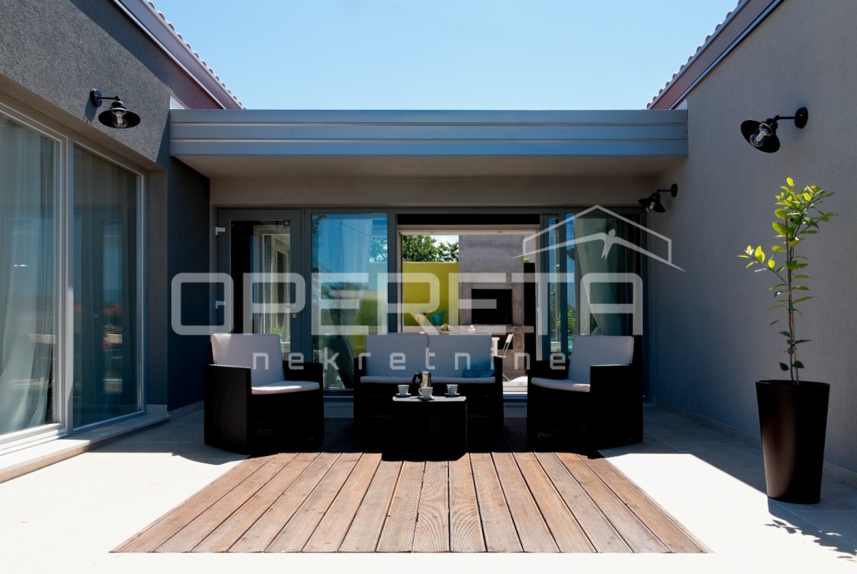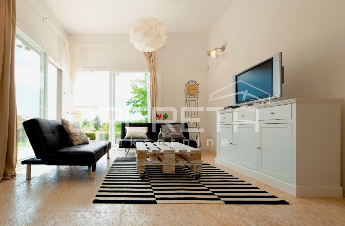 V mirni vasici v bližini Poreča, na parceli velikosti 324 m², stoji moderna montažna hiša z neto površino 117 m². Arhitekturna rešitev je bila premišljena tako, da hodnik ločuje bivalni in spalni del, s čimer je doseženo idealno ravnovesje med skupnim bivanjem in zasebnostjo.