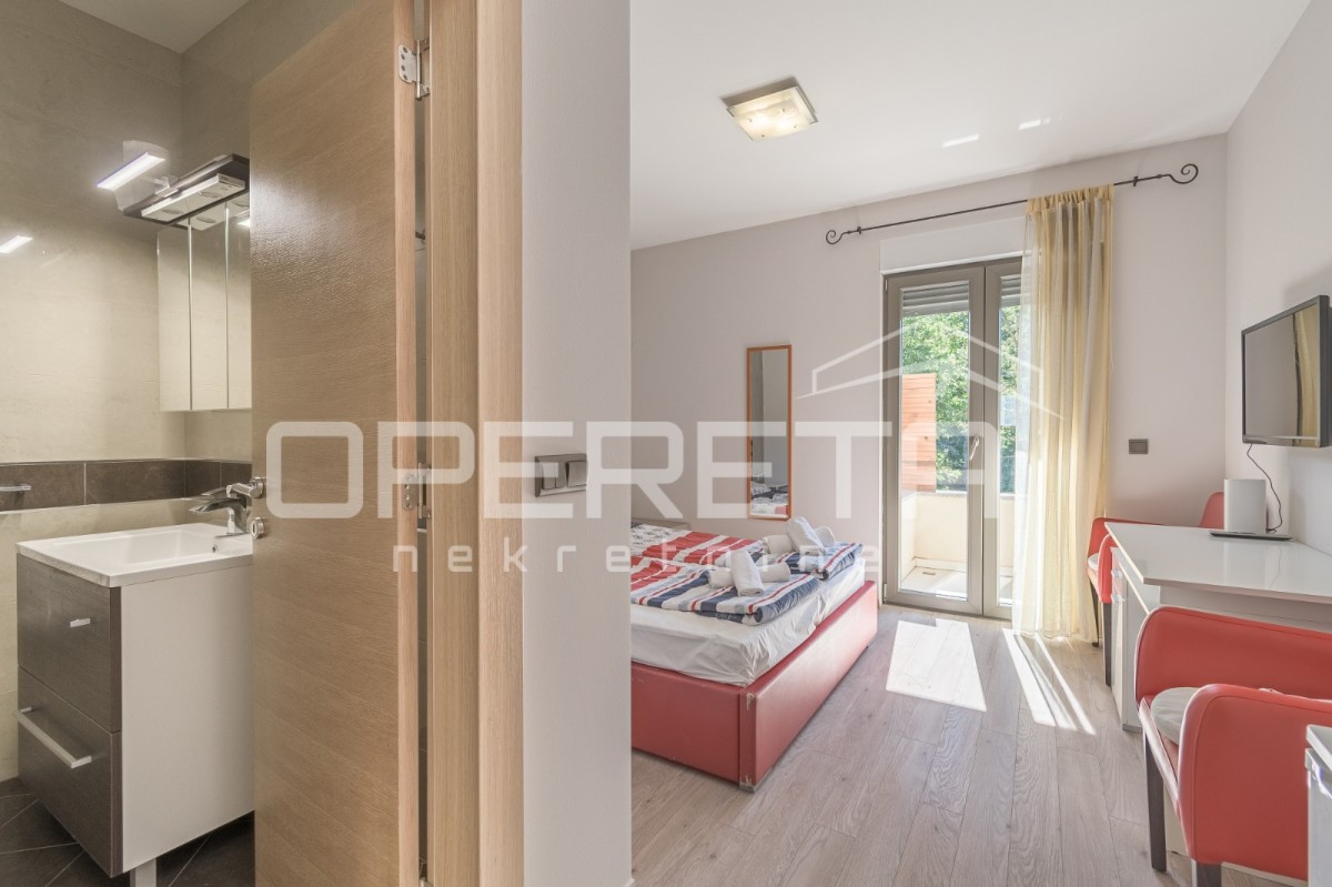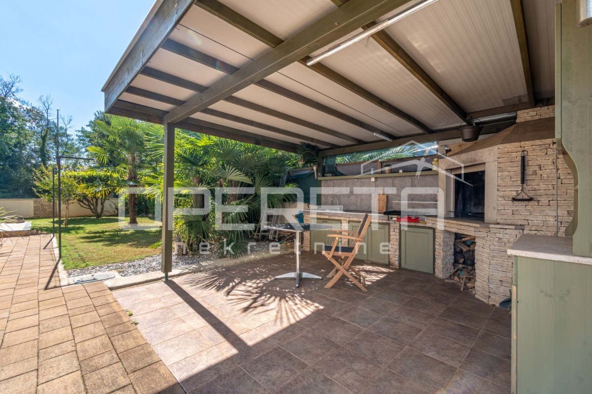 Na dvorišču je tudi popolnoma opremljena letna kuhinja z žarom, krušno pečjo ter priključki za vodo in elektriko, poleg nje pa še dodatna shramba. V nadstropju se nahaja drugo stanovanje z dvema spalnicama, od katerih ima vsaka svojo teraso s pogledom na naravo, tremi kopalnicami ter odprtim prostorom za kuhinjo, jedilnico in dnevno sobo, ki prav tako omogoča izhod na pokrito teraso.