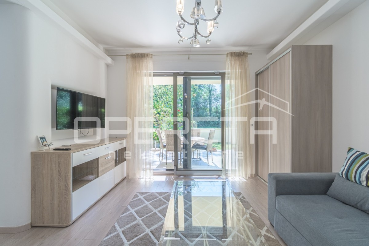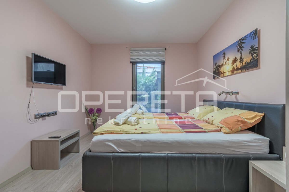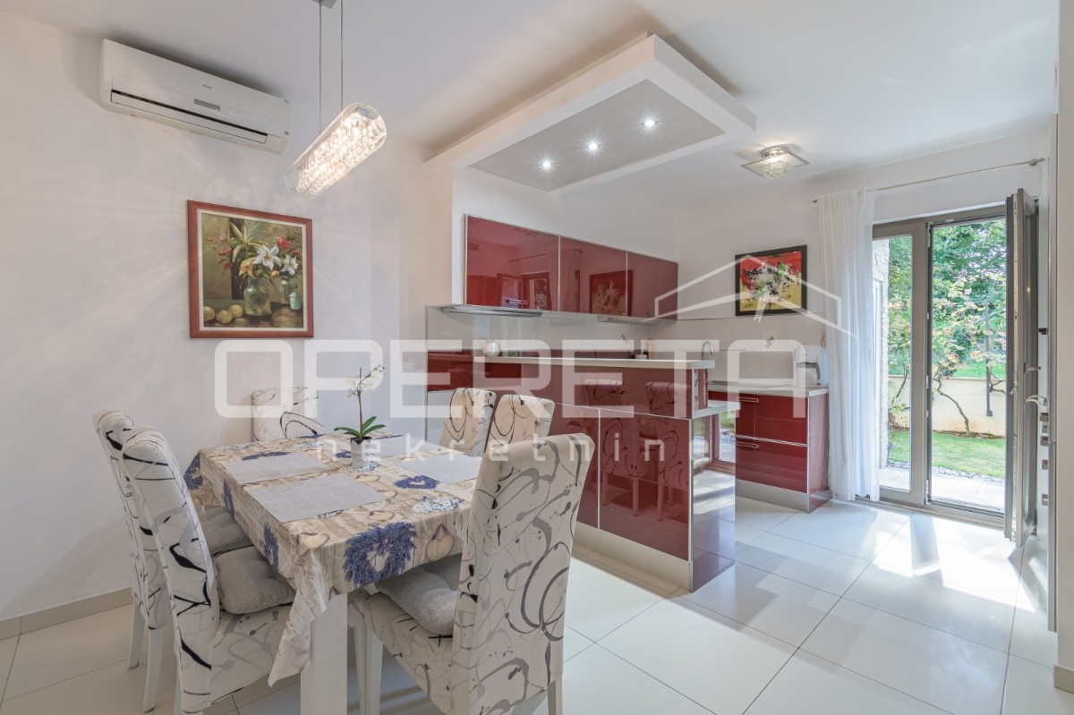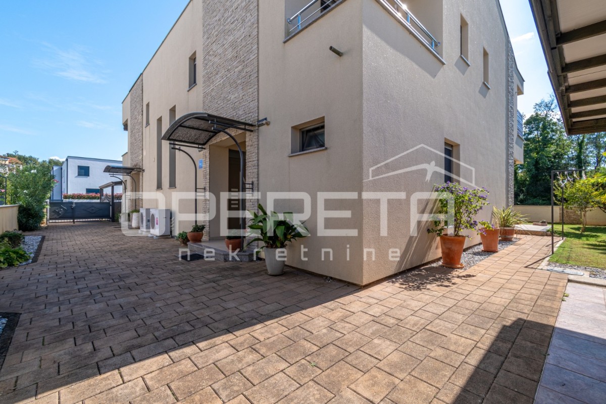 Ta dvojček se nahaja v širšem centru Poreča, na izjemno mirni lokaciji v eni izmed najbolj zaželenih stanovanjskih sosesk. Ker se nahaja na robu urbaniziranega območja, ponuja čudovit pogled na zelenje, njegova jugozahodna orientacija pa zagotavlja celodnevno osončenost.