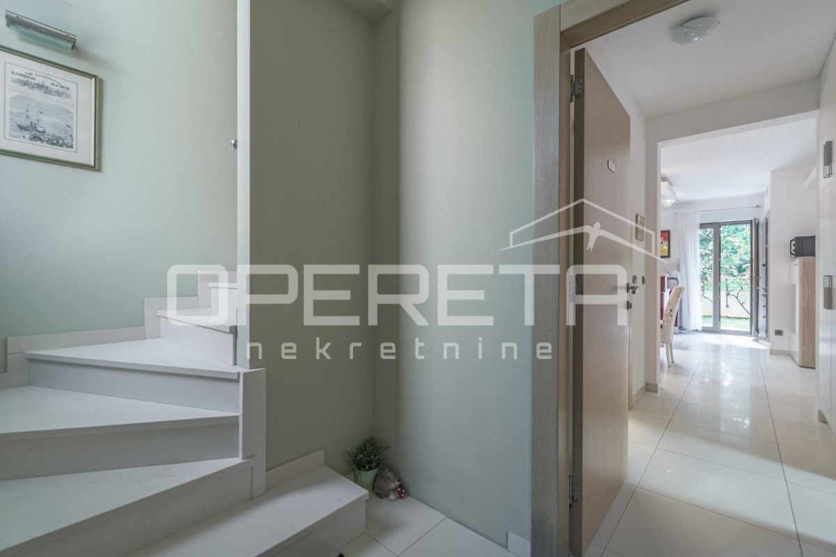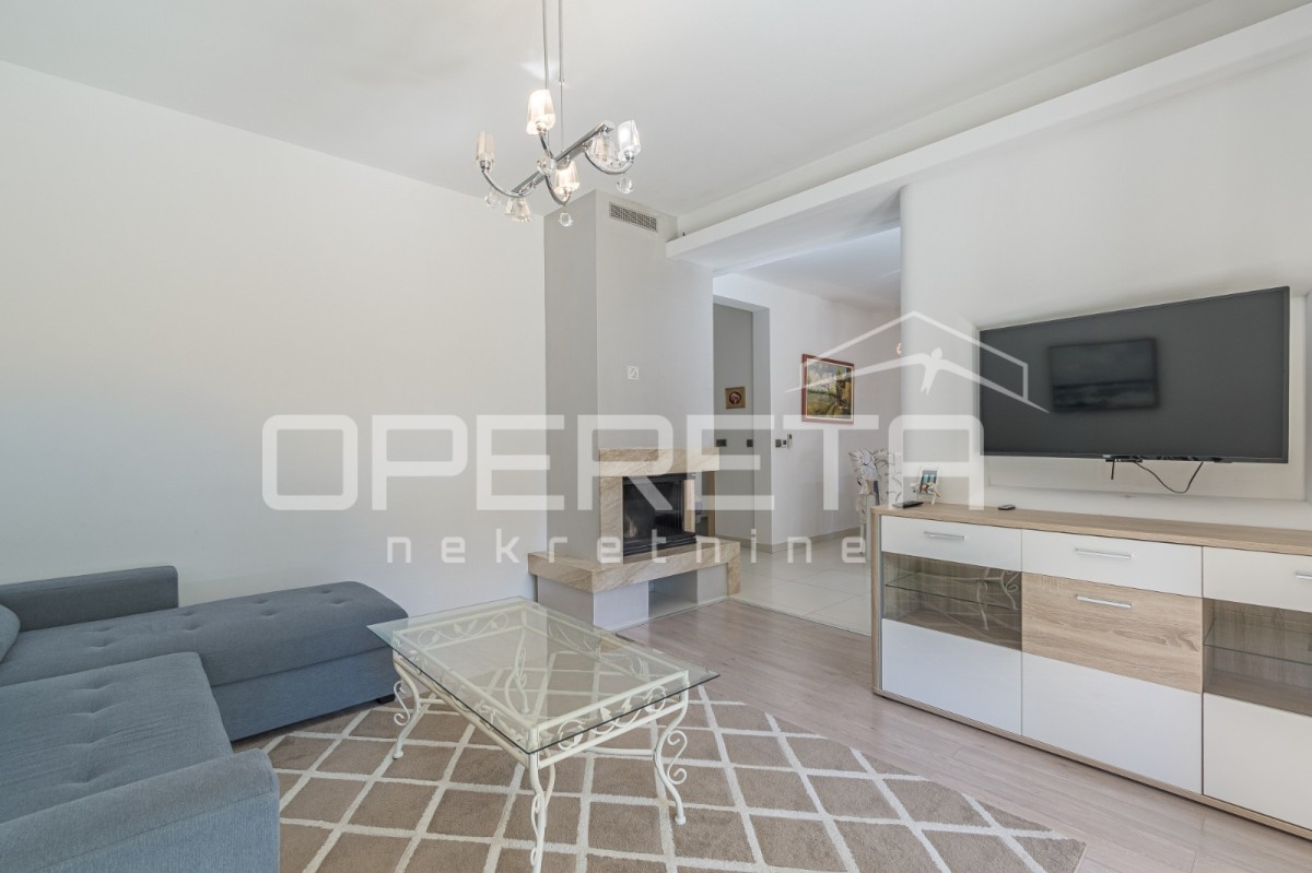 S skupno bivalno površino 143 m² se razprostira v pritličju in nadstropju ter je razdeljen na dve ločeni stanovanjski enoti. Pritličje obsega stanovanje s hodnikom, shrambo, eno spalnico z lastno kopalnico, kuhinjo, jedilnico in dnevno sobo z udobnim kaminom, iz katere se izhaja na teraso in lepo urejeno dvorišče v izmeri 184 m².