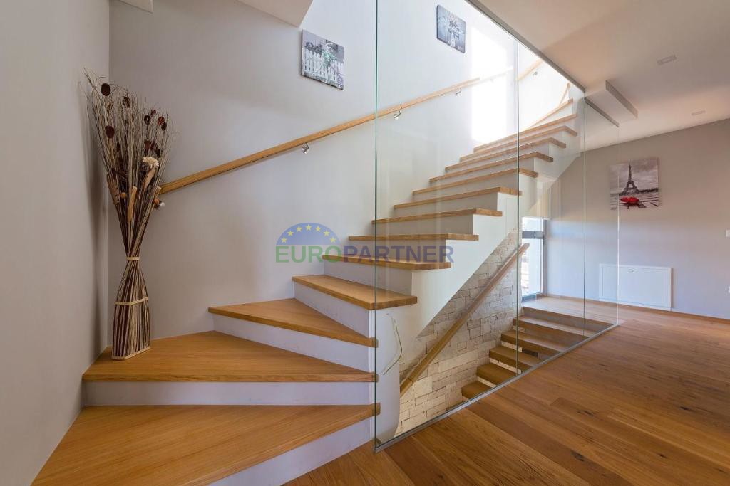 Kuhinja z otokom in velikimi steklenimi stenami ponuja pogled na teraso in bazen. V pritličju se nahajajo tudi shramba/garderoba, stranišče za goste in kamin na drva, ki prinaša toplino in prijetno vzdušje.