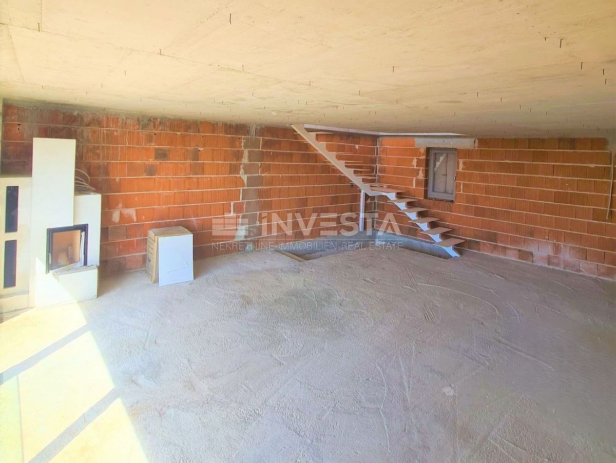 Hiša je zunaj dokončana, z moderno fasado in popolnoma novim zunanjim stavbnim pohištvom, kar ji daje privlačen videz. Vsi potrebni priključki za elektriko in vodo so že urejeni, medtem ko notranje inštalacije še niso dokončane, zato bo potrebno dodatno vlaganje za popolno dokončanje hiše.