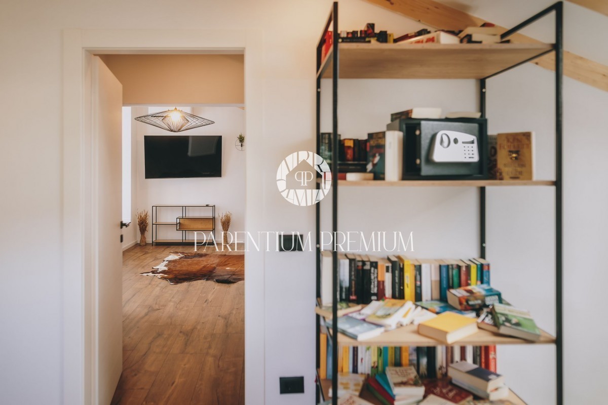 Stopnice vodijo v 1. nadstropje, kjer se nahaja študijska ali čitalniška knjižnica, kopalnica, tehnični prostor, prostorna spalnica z garderobo in balkon.