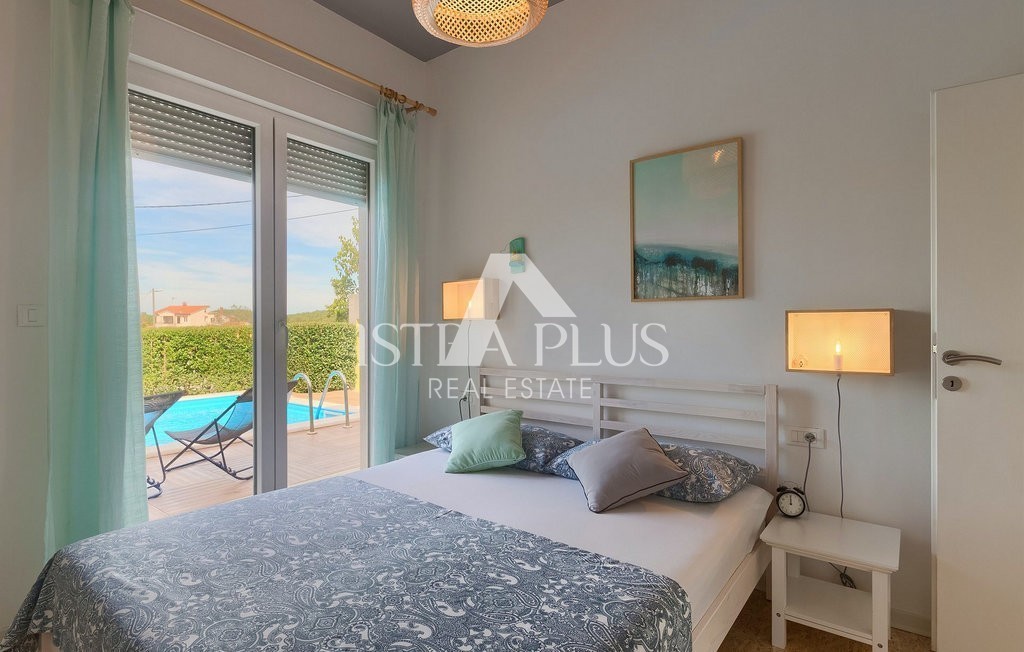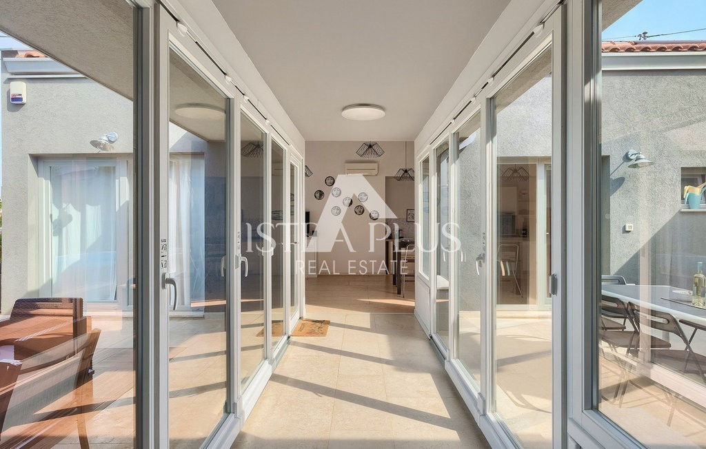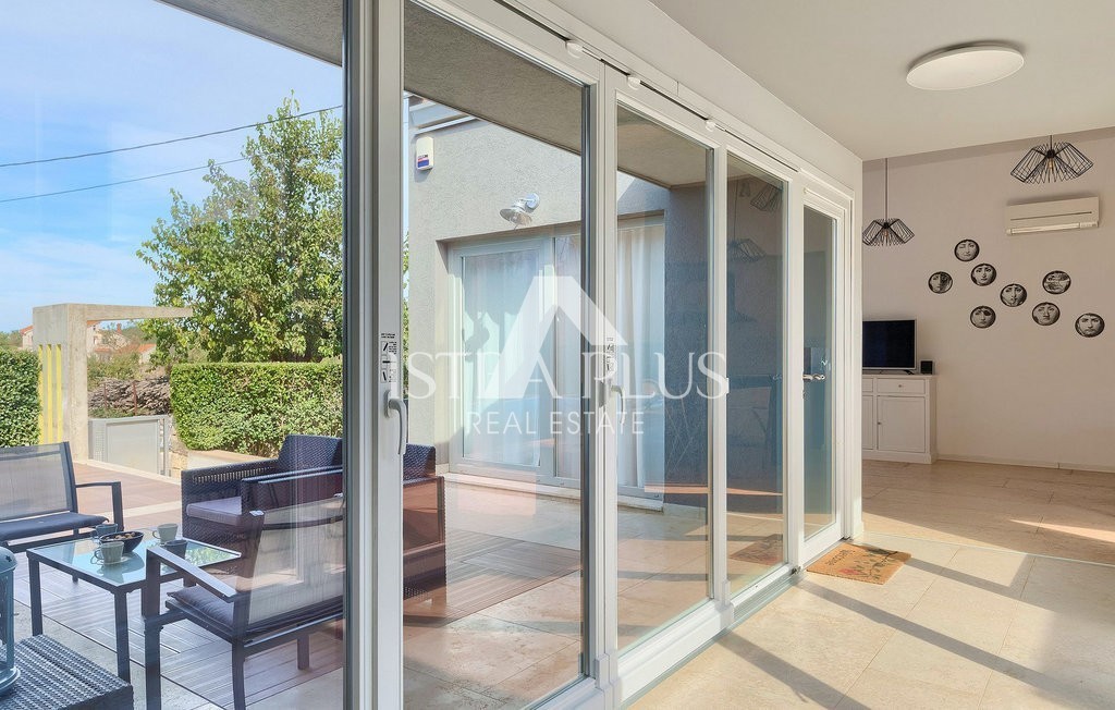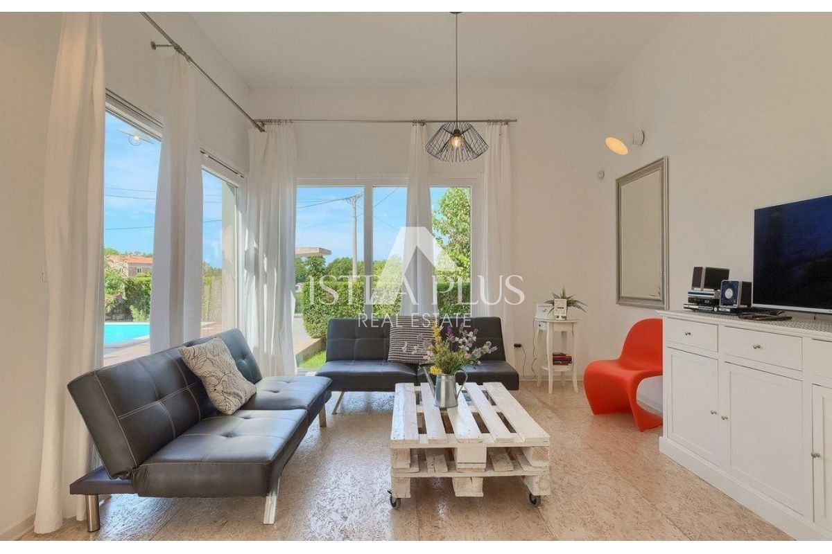 Dnevna soba se odpira na sončno teraso z bazenom, ki je popolna za uživanje v toplih poletnih dneh.