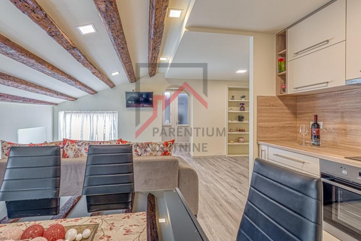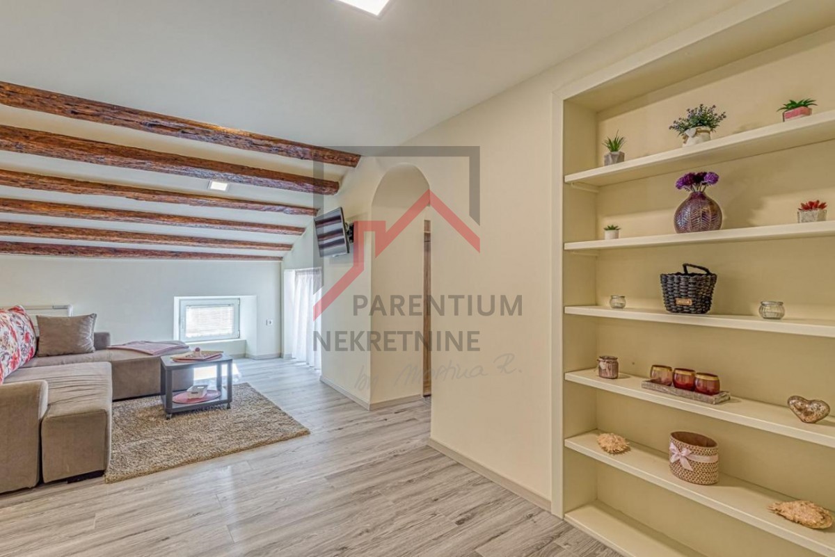 V tretjem nadstropju očarljive stanovanjske stavbe je to očarljivo stanovanje velikosti 48 m², pravo mansardno zatočišče z značajem. Prostorna spalnica, kopalnica in elegantno zasnovana odprta dnevna soba s kuhinjo in jedilnico ustvarjajo občutek lahkotnosti in zračnosti. Toda tisto, zaradi česar je ta apartma edinstven, je terasa – vaša zasebna oaza, s katere lahko uživate v božanskem, brezhibno čistem pogledu na Jadransko morje, kjer se modrina neba staplja z obzorjem.
