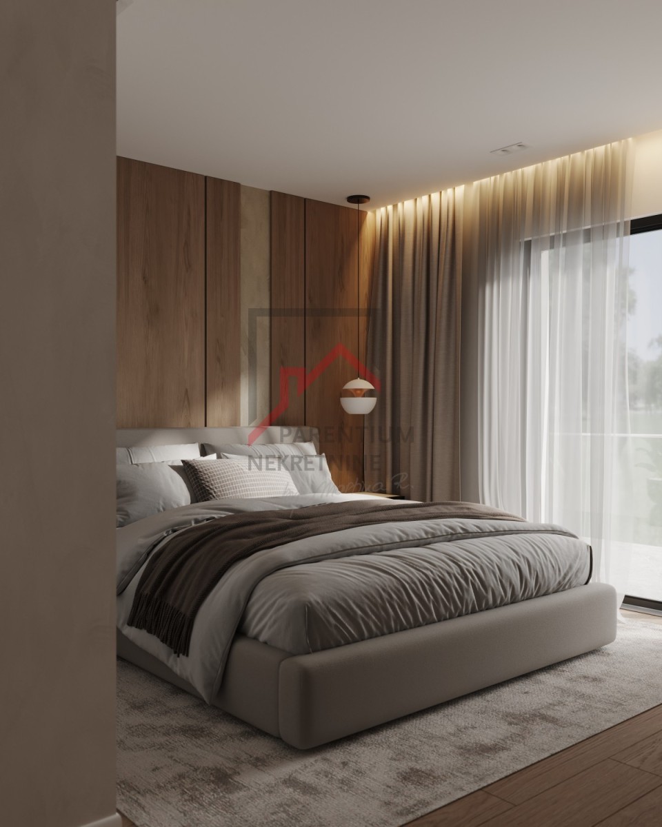 V zgornjem nadstropju so tri razkošne spalnice, vsaka s svojo kopalnico, kar zagotavlja zasebnost in udobje za vsakega člana družine. Glavna spalnica ima dostop do pokrite terase (19,30 m²), popolne za sprostitev s čudovitim panoramskim pogledom na morje.