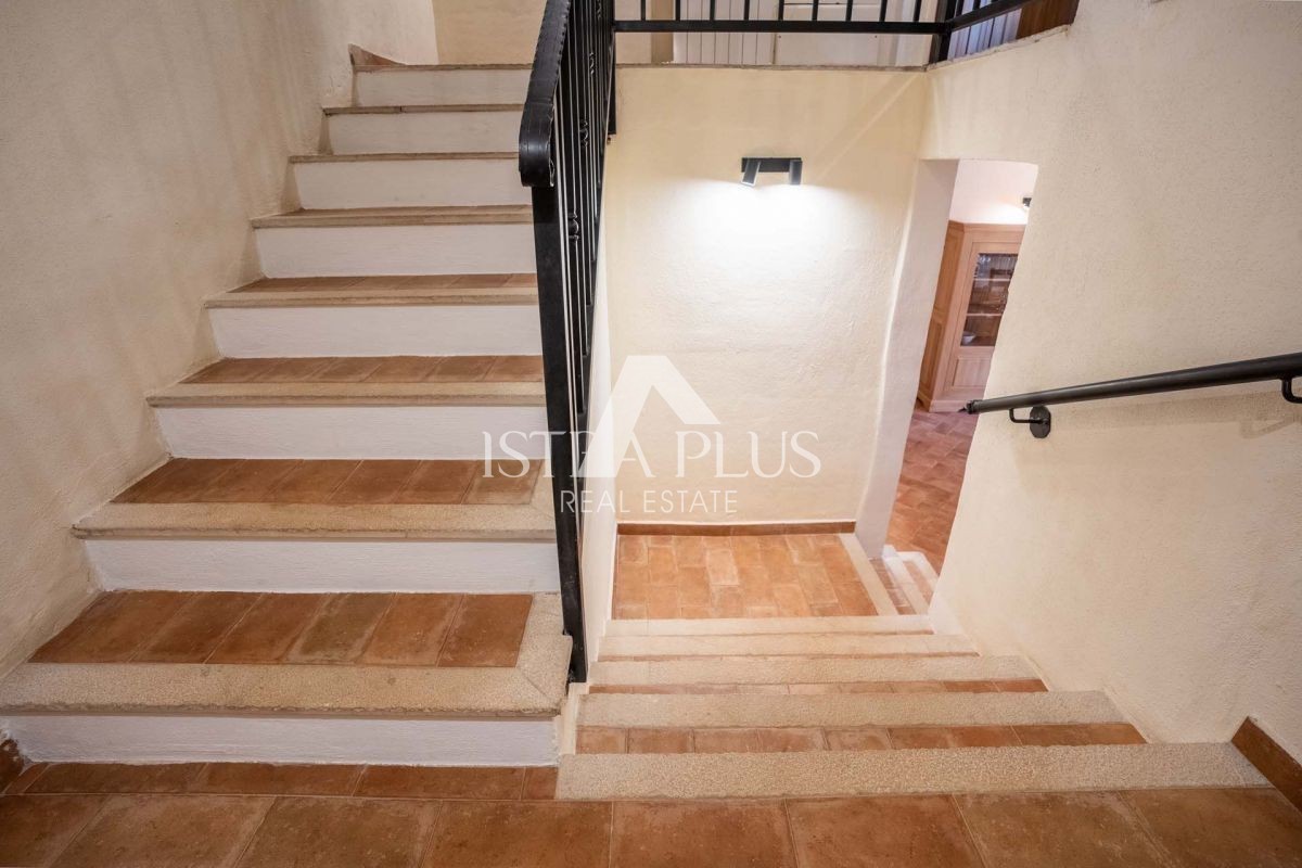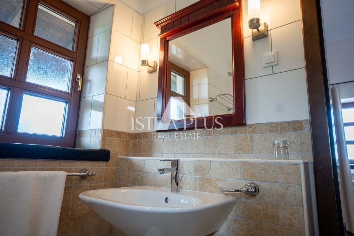 Ta očarljiva vila se razprostira v dveh nadstropjih – pritličju in prvem nadstropju – in izžareva toplino zahvaljujoč skrbno izbranemu rustikalnemu pohištvu iz hrasta. Prostoren, odprt bivalni prostor združuje popolnoma opremljeno kuhinjo in jedilnico ter dnevno sobo s kaminom, obloženim z dekorativnim kamnom. Celoten bivalni prostor se odpira na pokrito teraso z očarljivim razgledom na sončno teraso in bazen – idealen kraj za sprostitev kadar koli v dnevu.