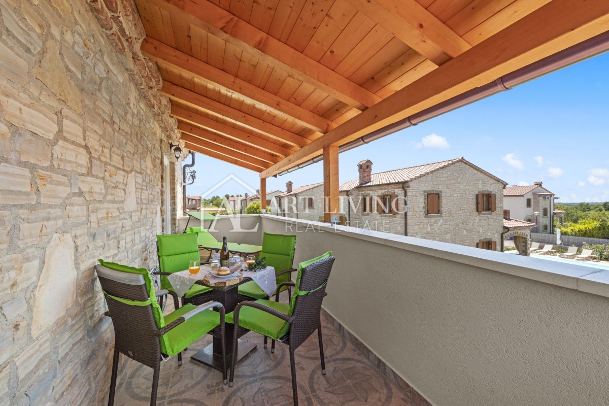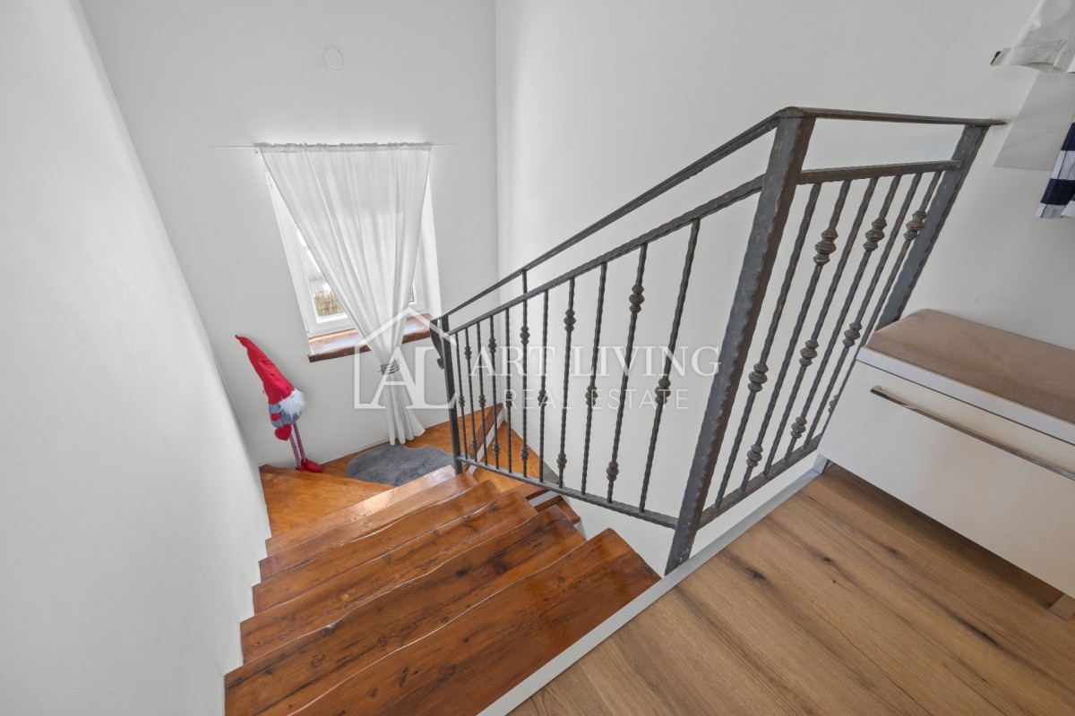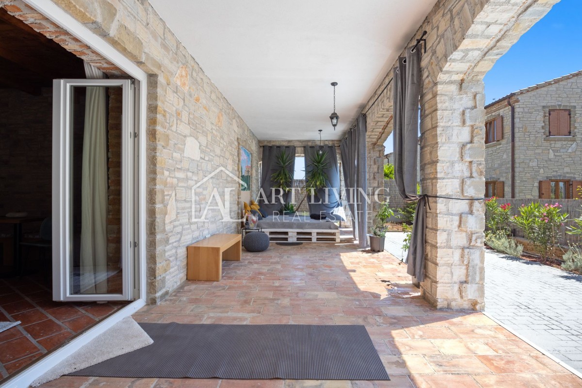 Nepremičnina je zgrajena iz visokokakovostnih materialov. Notranjost je udobna z elementi iz naravnega lesa, zunanjost pa je v istrskem kamnu.