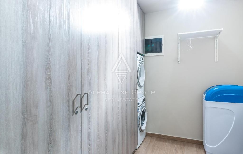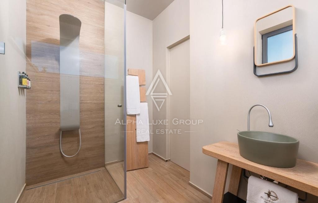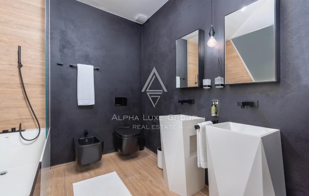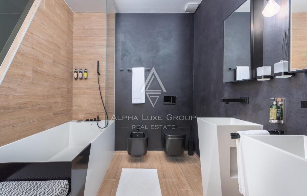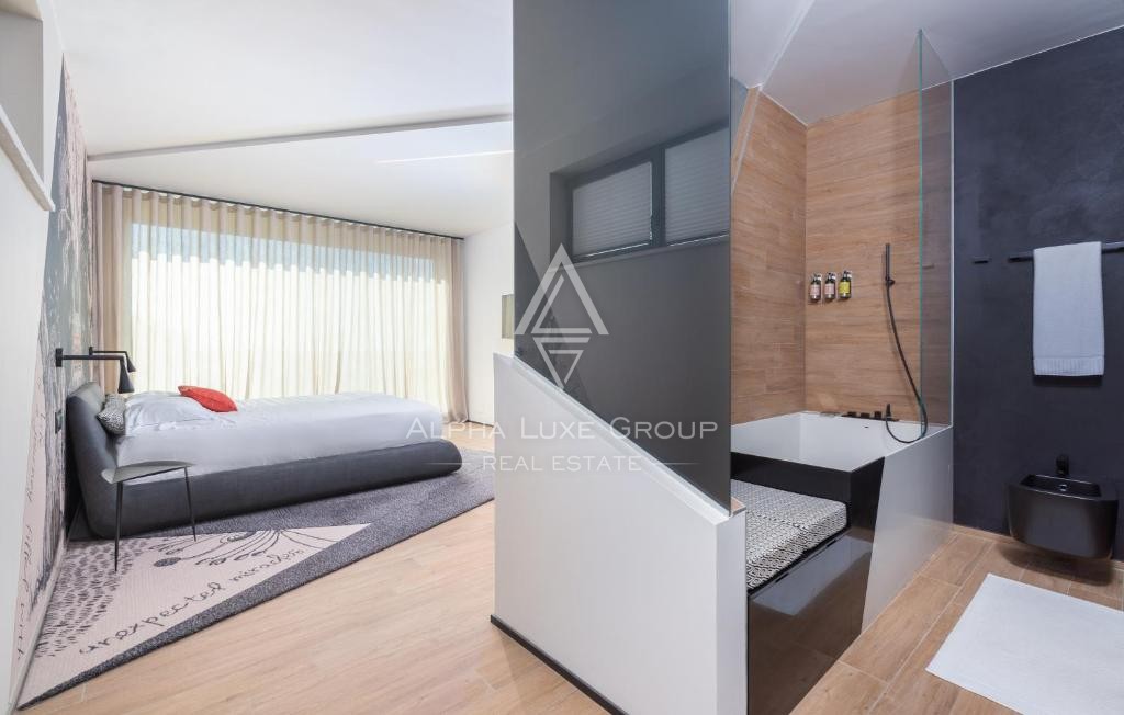 V nadstropju se nahaja zasebno wellness območje s savno in masažnim jacuzzijem ter dve elegantno oblikovani spalnici, vsaka s svojo kopalnico. Takšna zasnova nudi sproščujoče okolje in popolno zasebnost.