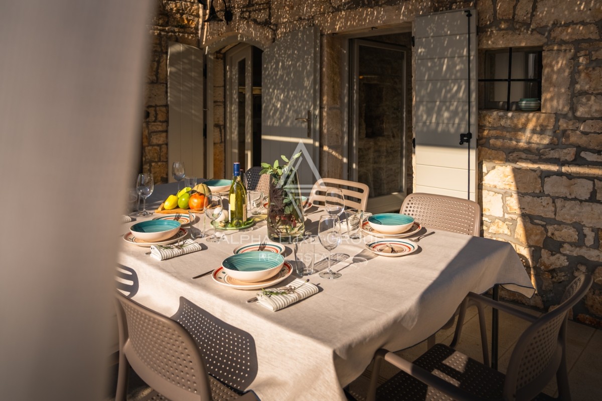 Na prostem boste našli zasebni ogrevan bazen s slano vodo velikosti 23 m², opremljen z ležalniki, senčniki in zunanjo prho. Pokrita terasa z žarom, zunanjo kuhinjo in kamnitim kotičkom za druženje vabi k obrokom na prostem. Ograjen vrt z bujnim mediteranskim rastlinjem zagotavlja zasebnost in varnost za družino.