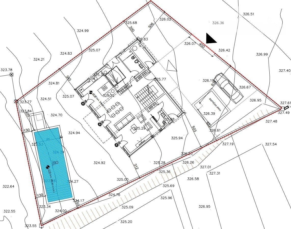 Zunaj se čudovit vrt ponaša s 31 m² velikim prelivnim bazenom s slano vodo in sončno teraso, opremljeno z ležalniki. Trato krasijo sredozemske rastline in oljke, ki dajejo mirno in pomirjujoče ozadje. Zunanjost zaključuje kamnit zid, ki oklepa parkirišče za dva avtomobila.