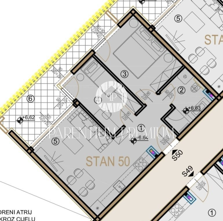 Stanovanje S50, skupne površine 50,50 m2, se nahaja v drugem nadstropju v RUMENI PLUS CONI.