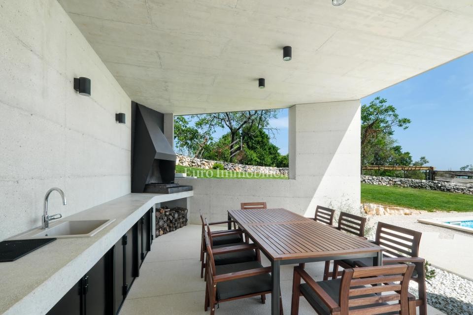 U prizemlju je smješten open space dnevni boravak, kuhinja i blagovaonica iz kojih se pristupa okućnici s bazenom, vanjskom kuhinjom i blagovaonicom na otvorenom. Na katu su tri spavaće sobe, svaka s vlastitom kupaonicom.