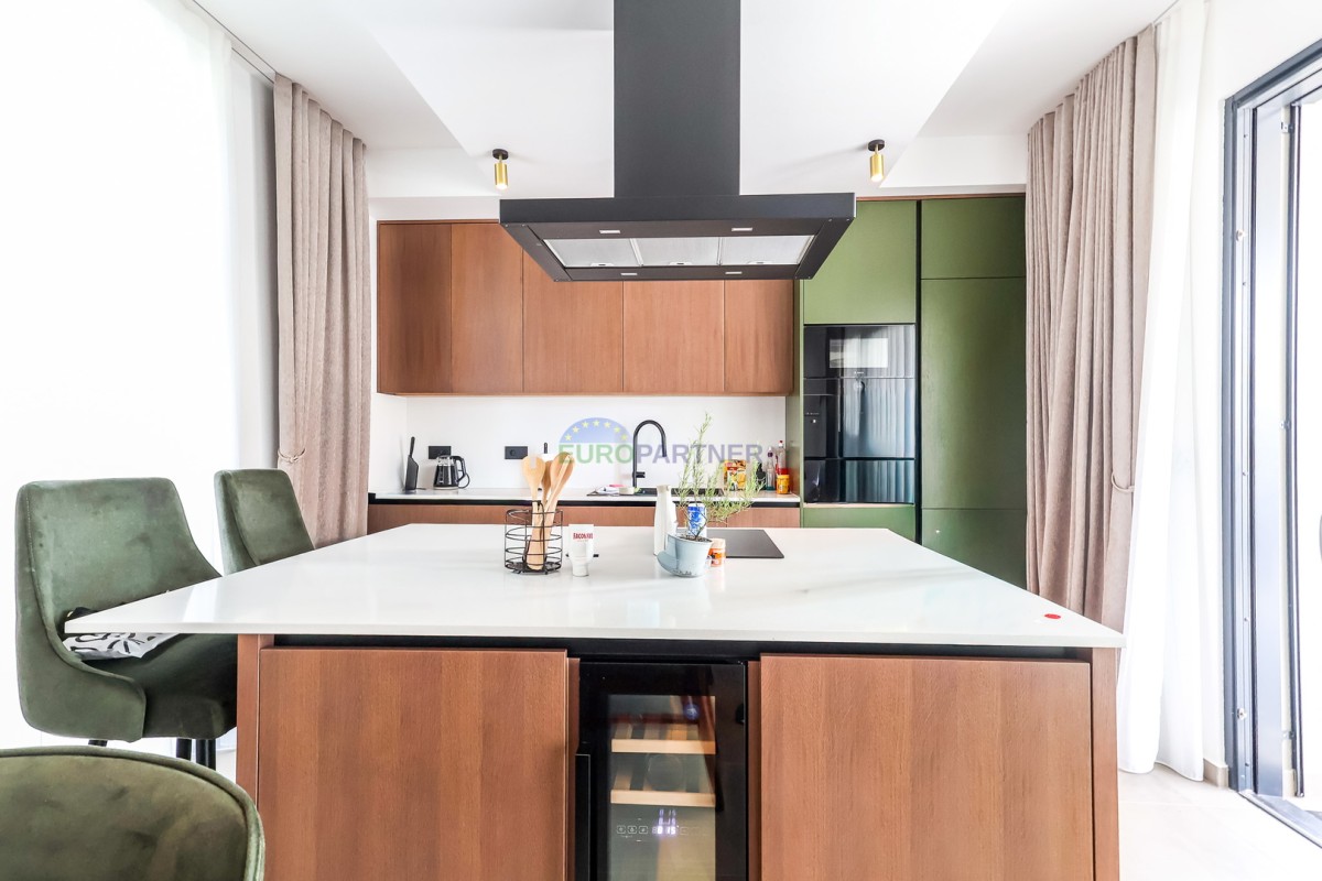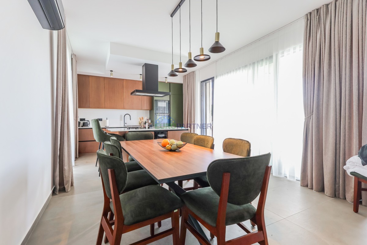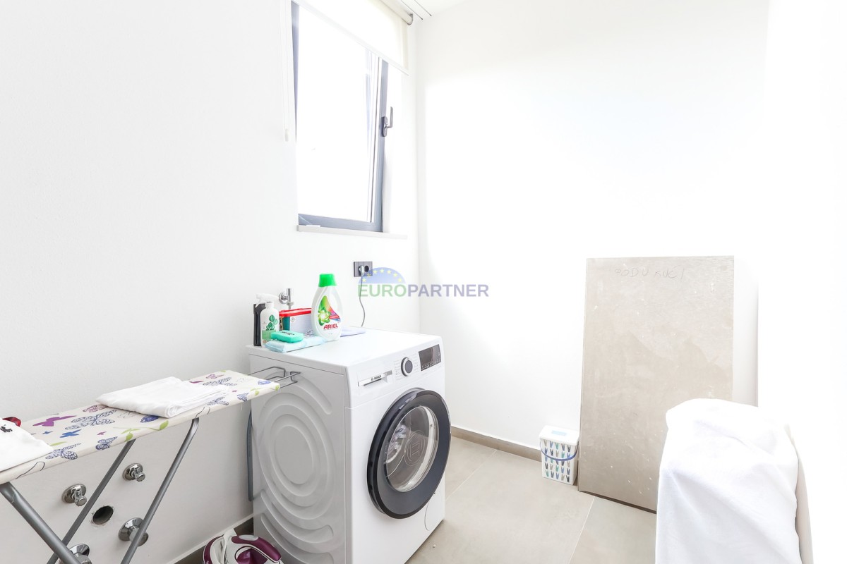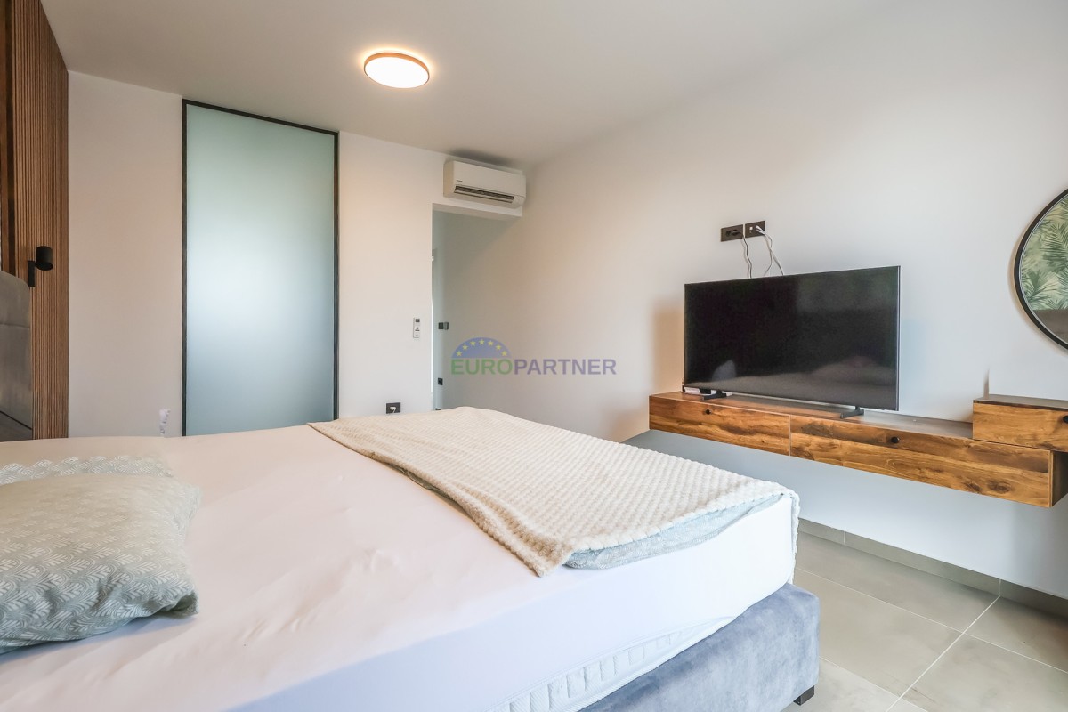 Vila se razteza čez pritličje in prvo nadstropje. Pritličje obsega predsobo, shrambo, tehnični prostor, pralnico, wc, dnevno sobo, kuhinjo in jedilnico ter pokrito teraso ob bazenu. Nadstropje je sestavljeno iz 4 spalnic z lastnimi kopalnicami, balkonom in teraso. Na dvorišču je 28m2 bazen. Vila ima tudi garažo za en avto (na voljo je prostor s polnilnico za električni avto), ter še eno zunanje parkirno mesto.