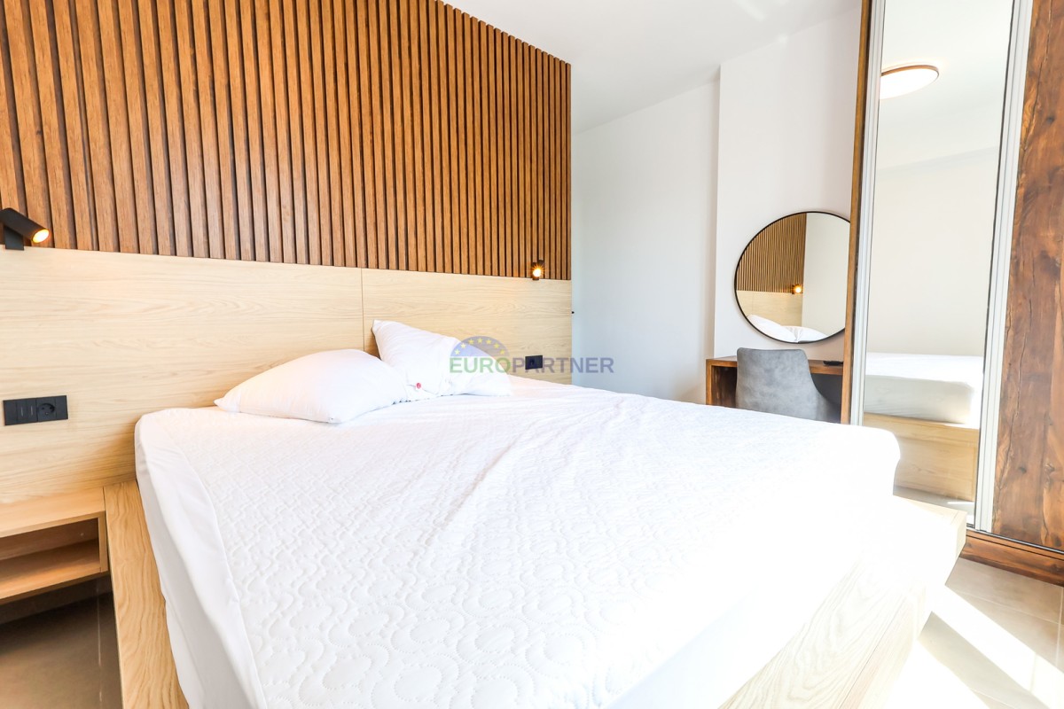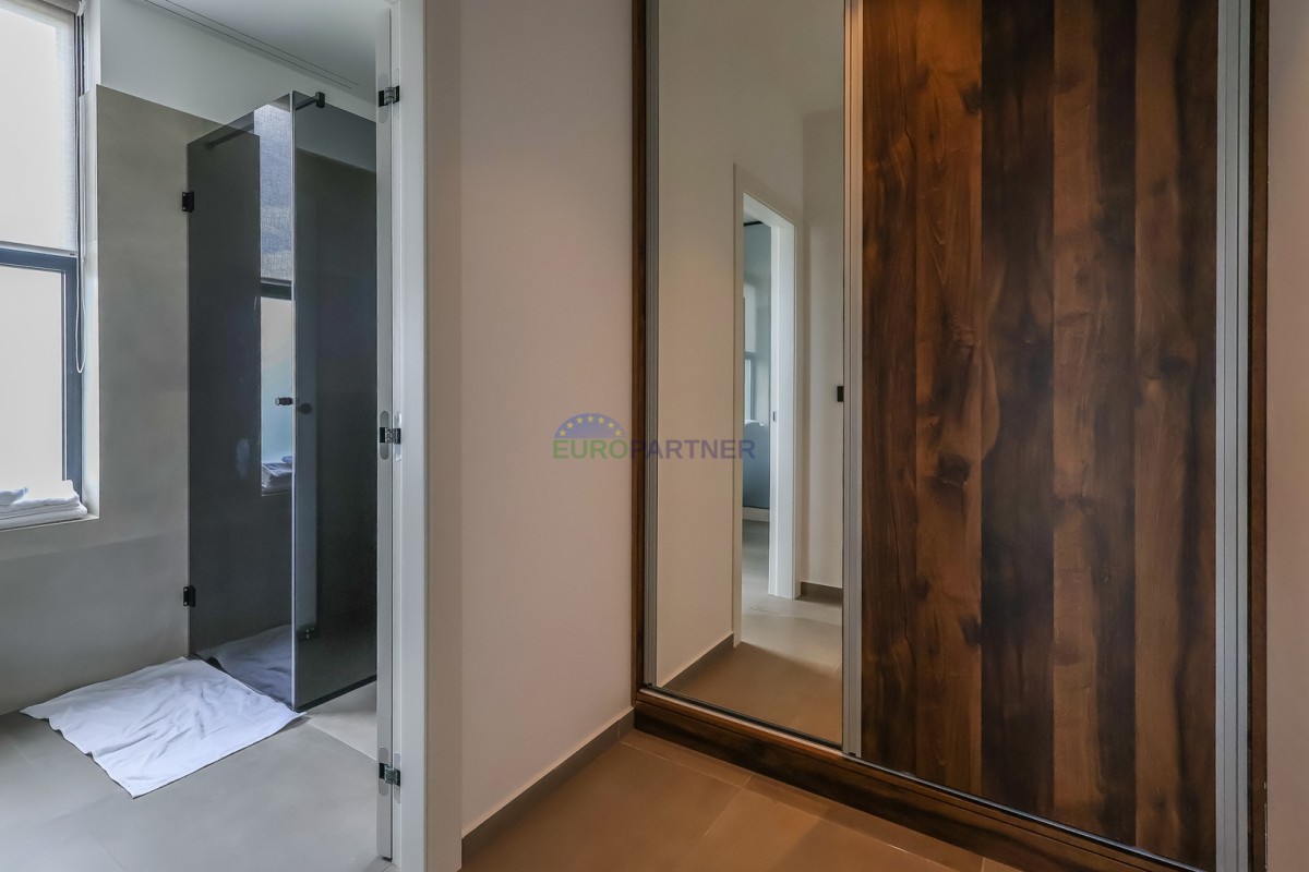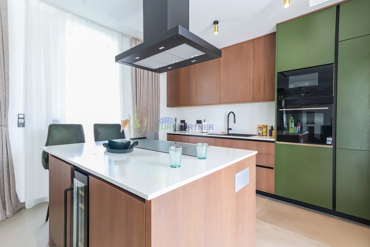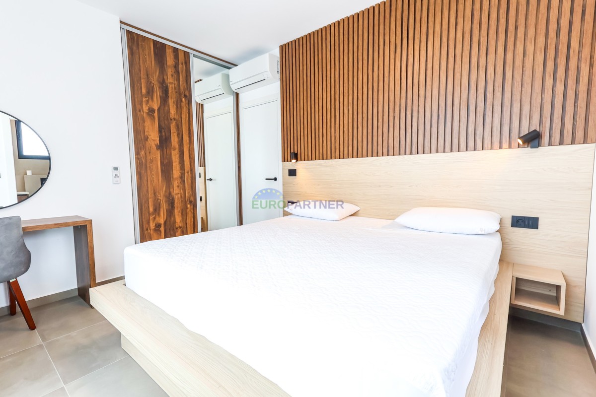 Vila se razteza čez pritličje in prvo nadstropje. Pritličje obsega predsobo, shrambo, tehnični prostor, pralnico, wc, dnevno sobo, kuhinjo in jedilnico ter pokrito teraso ob bazenu. Nadstropje je sestavljeno iz 4 spalnic z lastnimi kopalnicami, balkonom in teraso. Na dvorišču je 28m2 bazen. Vila ima tudi garažo za en avto (na voljo je prostor s polnilnico za električni avto), ter še eno zunanje parkirno mesto.