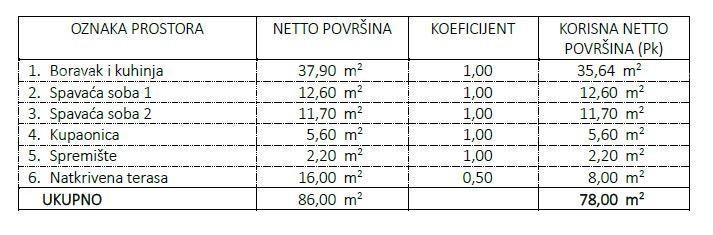 Stan tip C, površine 85,6 m2, se nahaja v 1. nadstropju stavbe z dvigalom in obsega vhodni del, dnevno sobo s kuhinjo in jedilnico, 2 spalnici, kopalnico in veliko teraso.