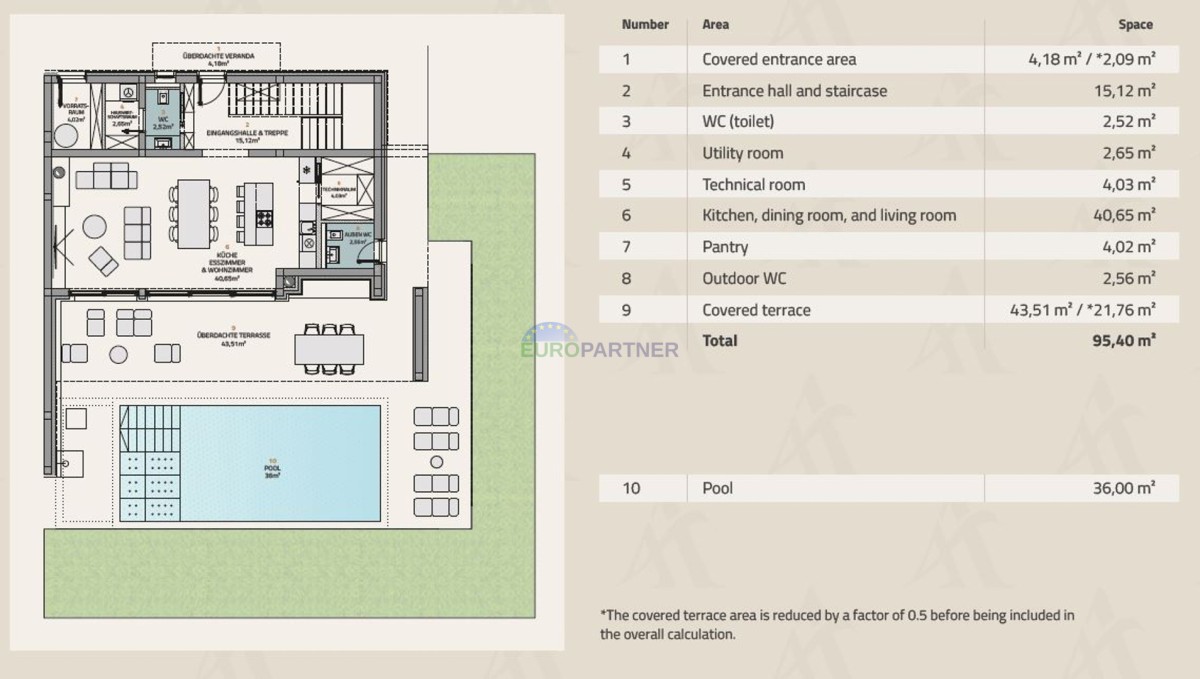 V tem oglasu vam predstavljamo polovico vile, ki ima 186,54 m2 bivalne površine in 624 m2 vrta. Vila se razteza čez pritličje in prvo nadstropje. Pritličje obsega predprostor, wc, tehnični prostor, kurilnico, zunanji wc, dnevno sobo, kuhinjo in jedilnico ter pokrito teraso v nadaljevanju katere je 36m2 velik bazen. . V prvem nadstropju je hodnik in 3 spalnice z lastnimi kopalnicami in izhodi na prostorno teraso. Bazen bo imel ogrevan sistem!