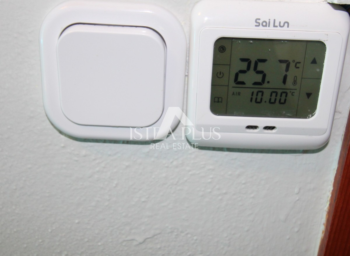 Ogrevanje in hlajenje je možno preko klimatske naprave, v vsakem prostoru so stropne plošče BYSUN s termostatom za električno ogrevanje, v dnevnem prostoru pa se nahaja peč na drva.