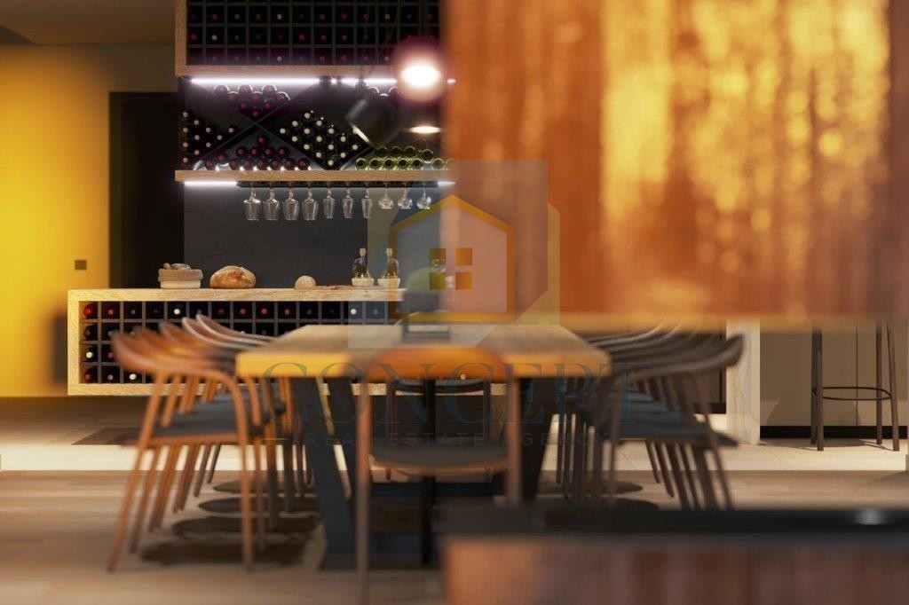 V pritličju se nahajajo vhodna hodnik, toalet za goste, odprt dnevni prostor, ki vključuje kuhinjo z jedilnico in dnevno sobo, z izhodom na pokrito teraso, na kateri se nahaja poletna kuhinja velikosti 42 m², toalet in shrambe. V pritličju je tudi ena spalnica z lastno kopalnico.