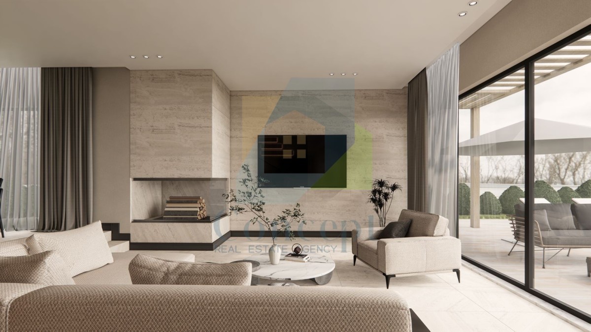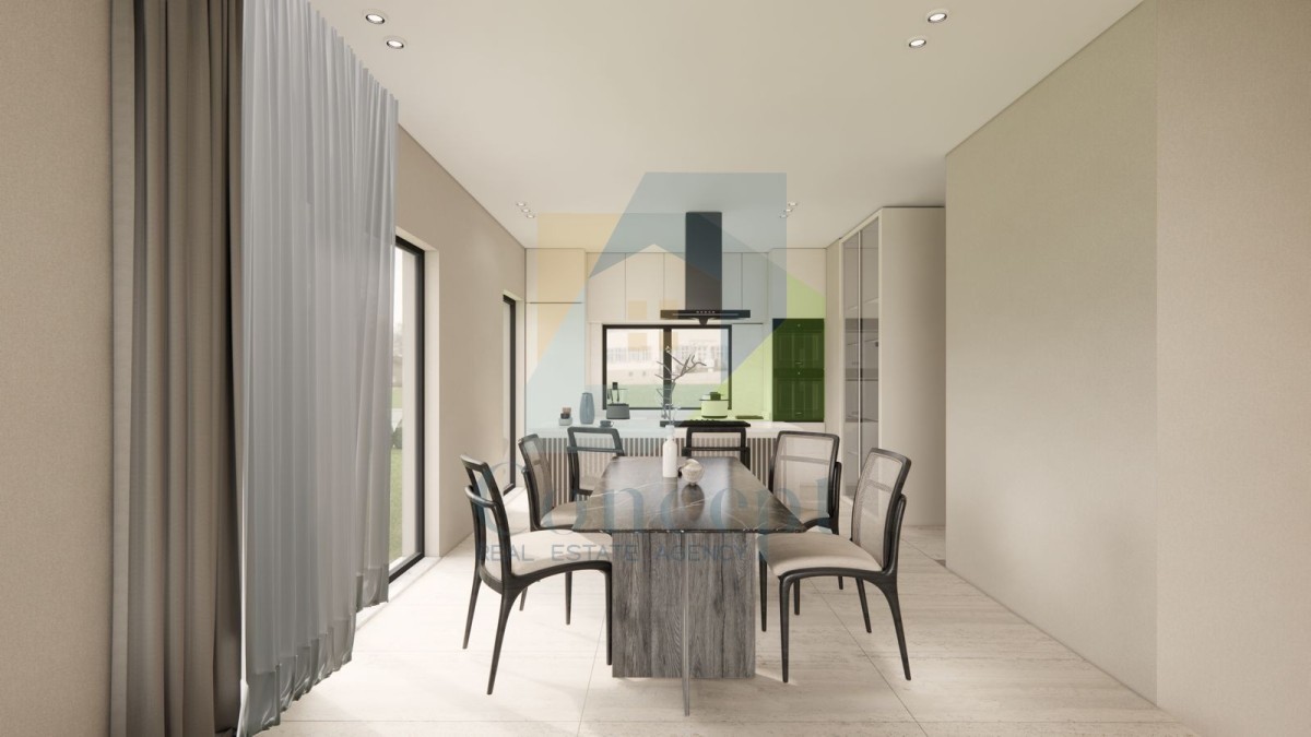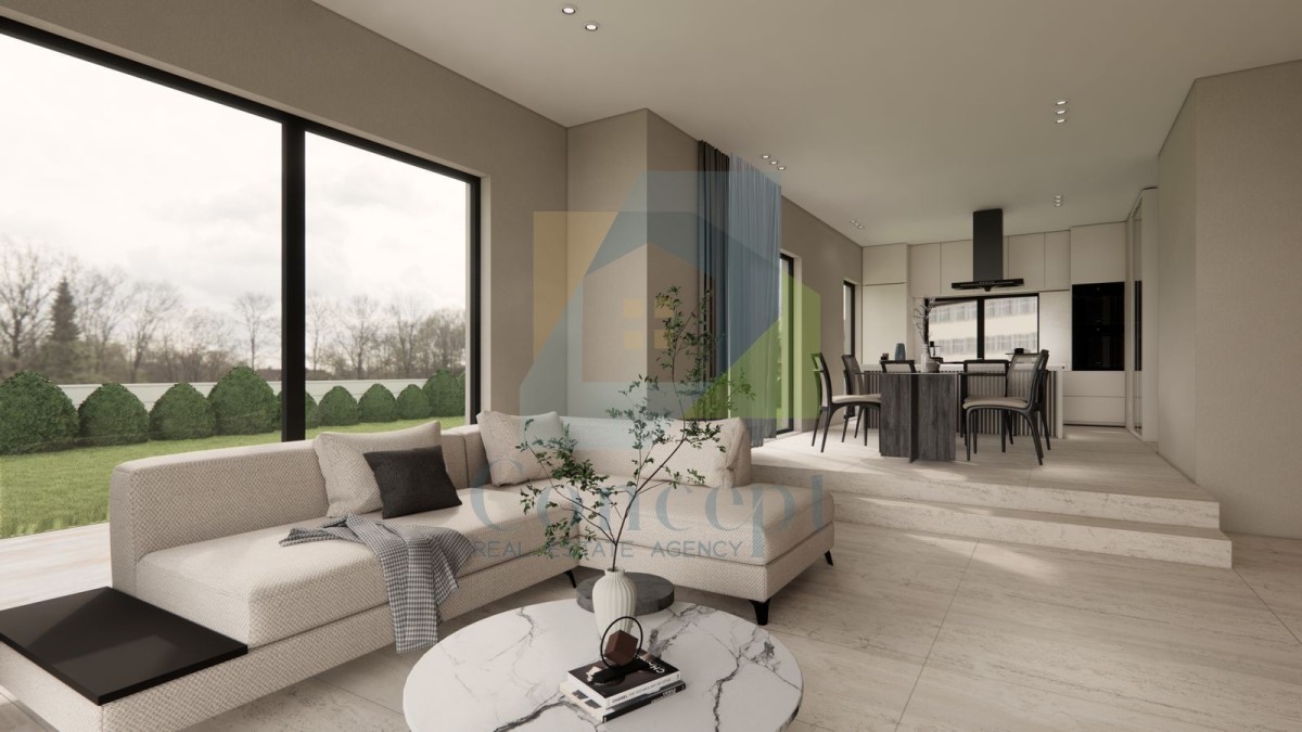 Hiša se razteza na dveh etažah in ima neto površino 156,5 m². Pritličje obsega vhodno hodnik, prostoren dnevni prostor s kuhinjo in jedilnico, shrambo in stranišče. Iz dnevnega dela se izide v dvorišče površine 300 m², kjer se nahaja ogrevani bazen dimenzij 8 × 5,5 m, prav tako pa tudi prostor za bivanje na prostem.