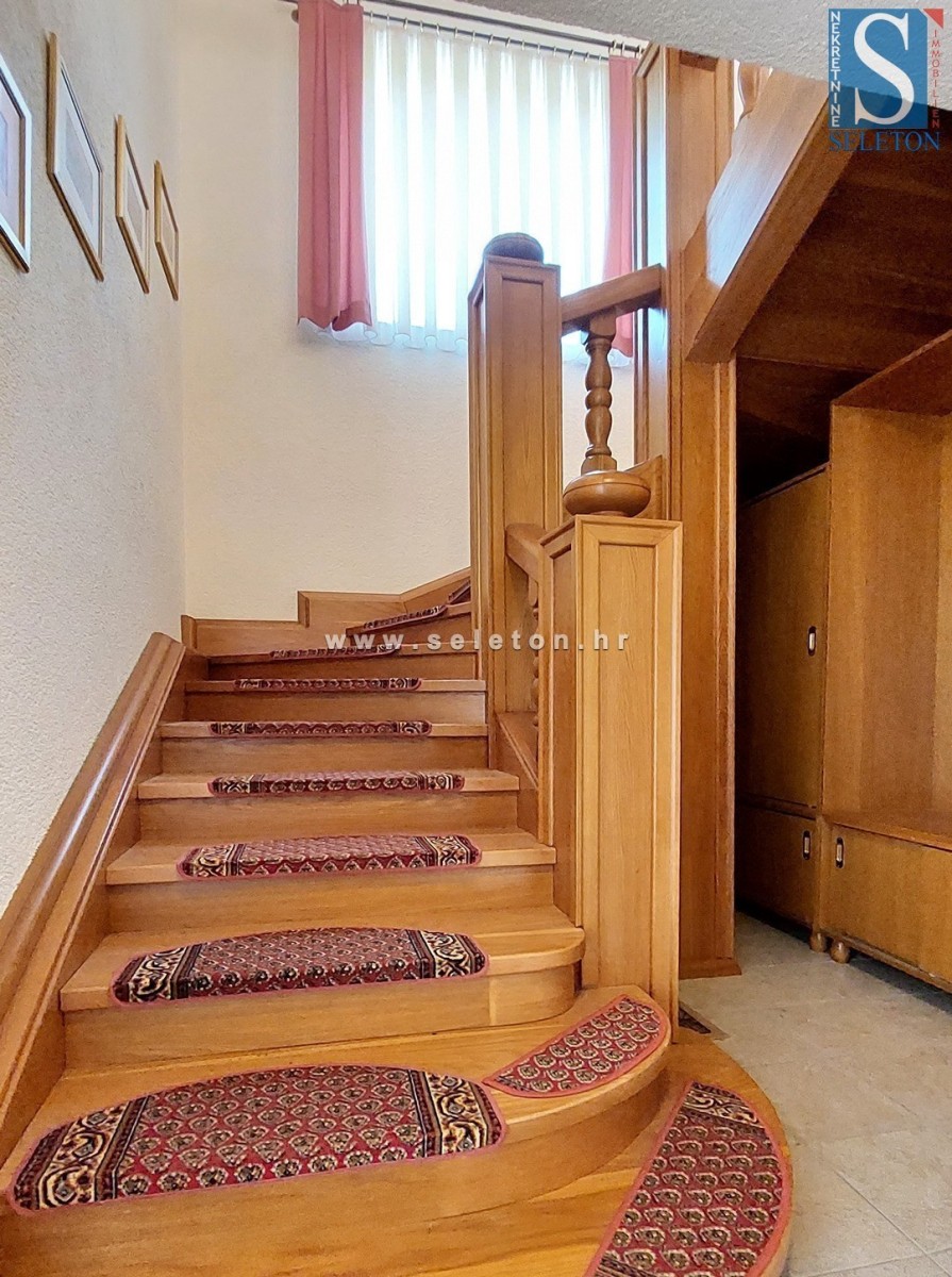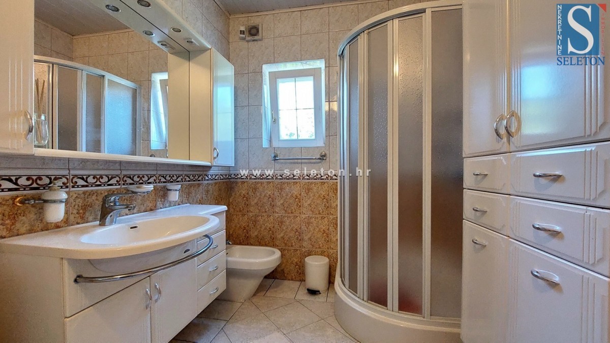 Prodamo samostojno hišo s skupno površino 357 m2 v okolici Poreča, sestavljeno iz velikega dvonadstropnega stanovanja v pritličju in prvem nadstropju hiše s površino 259 m2, stanovanja od 51 m2, garaža 25 m2, konoba in shramba. Dvonadstropno stanovanje obsega dnevno sobo, zaprto teraso (zimski vrt) s pogledom na morje, 5 sob, 3 kopalnice, WC za goste in balkon.