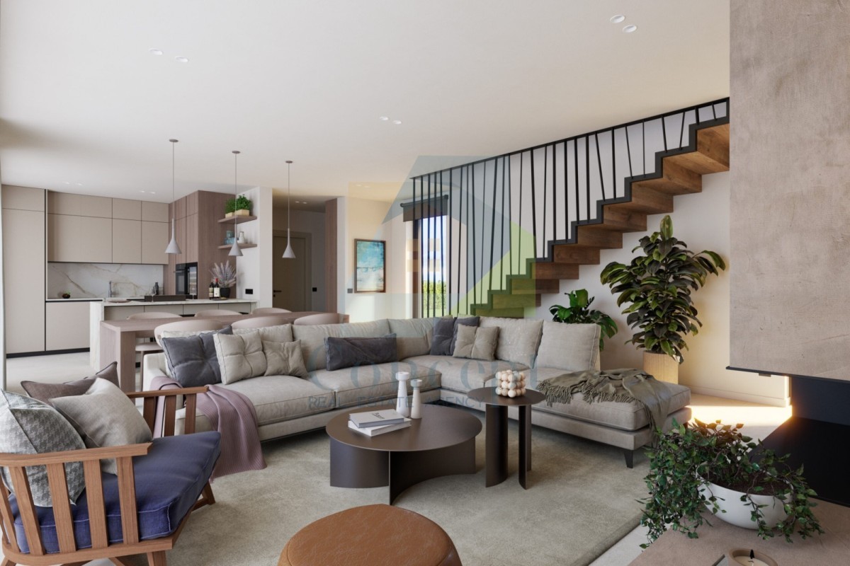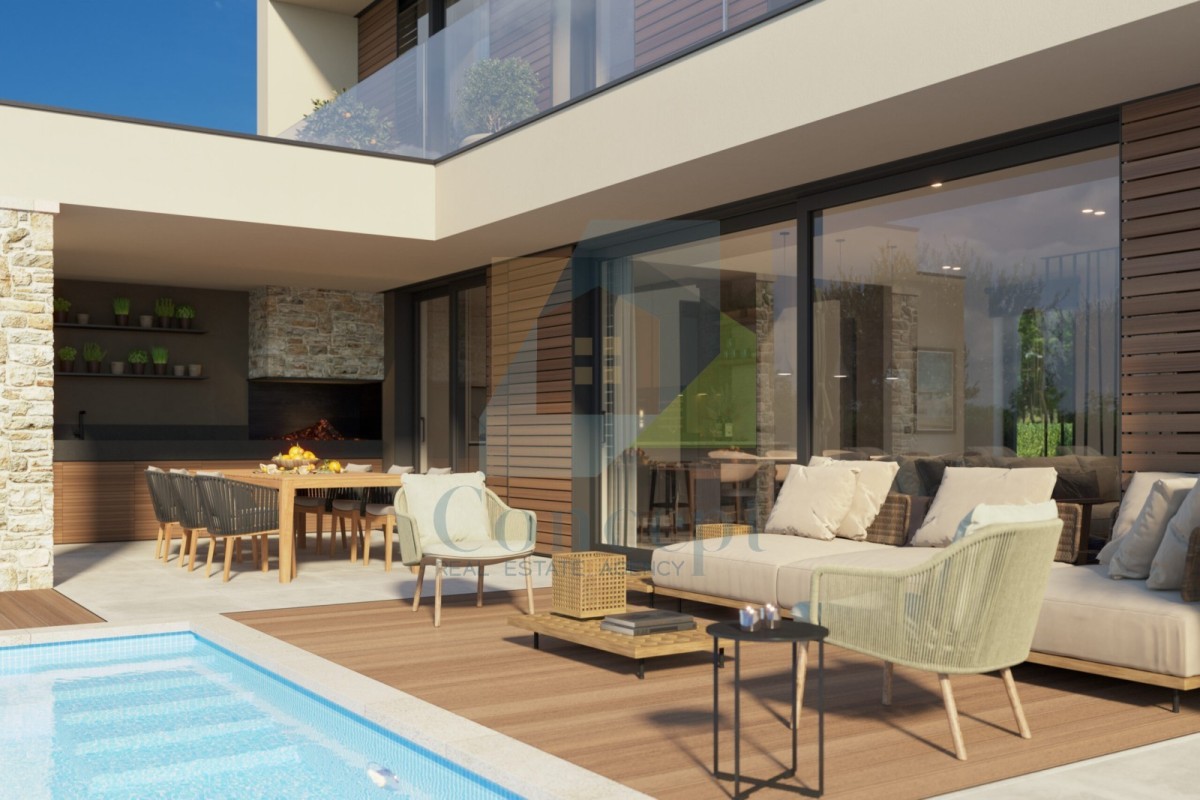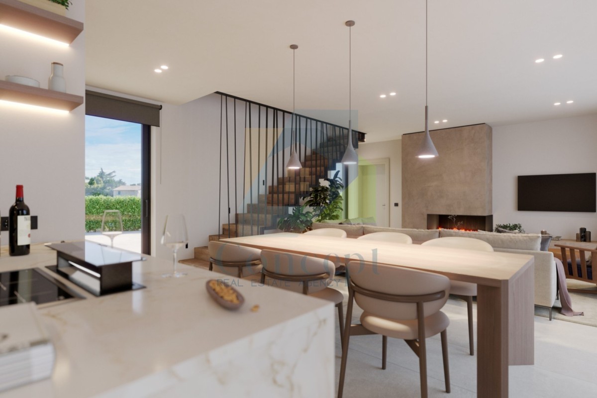 Prodaja se dvojna hiša, nameščena v mirnem naselju v okolici Poreča, oddaljena 10 km od morja in 12 km od mesta. Hiša bo imela približno 205 m², razporejenih na dveh etažah.