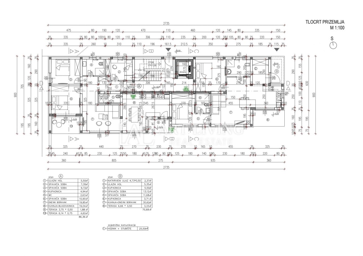 Stanovanje A se nahaja v pritličju in ima skupno površino 86,36 m².