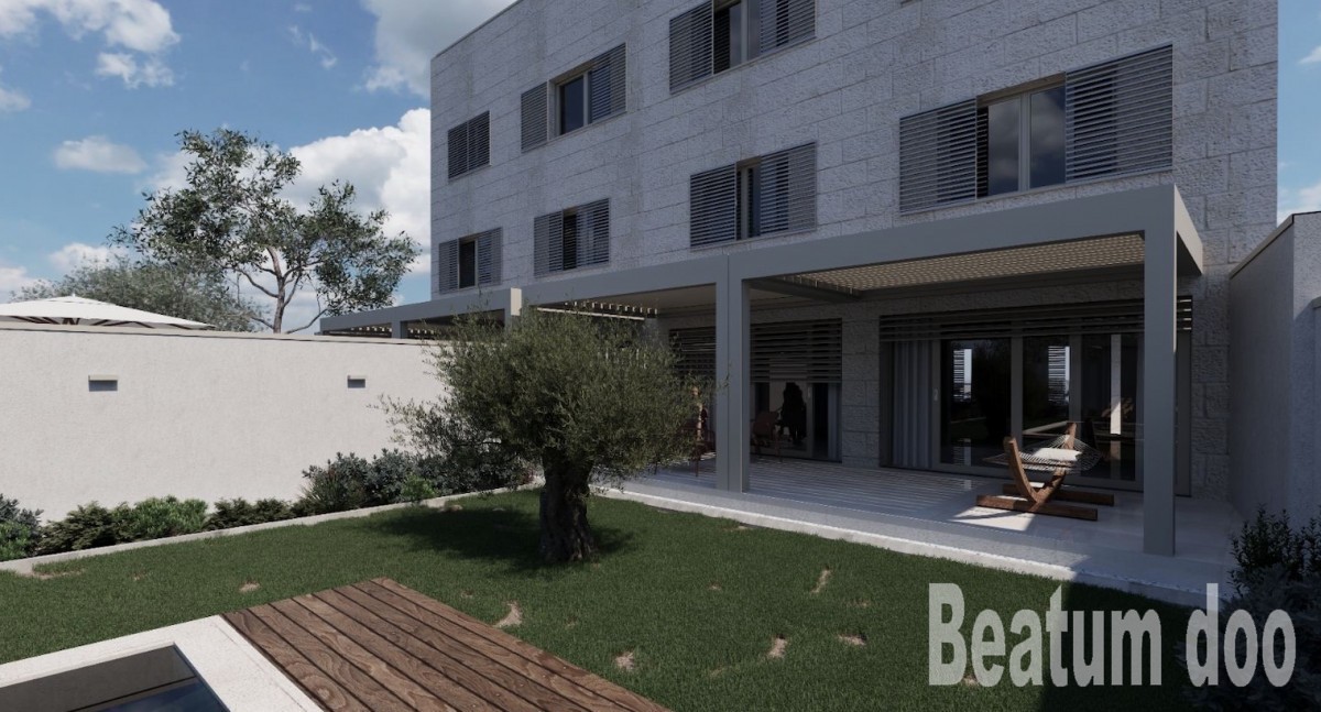Zgoraj: dve spalnici, dve kopalnici, dnevna soba, veliki balkoni v vsaki sobi