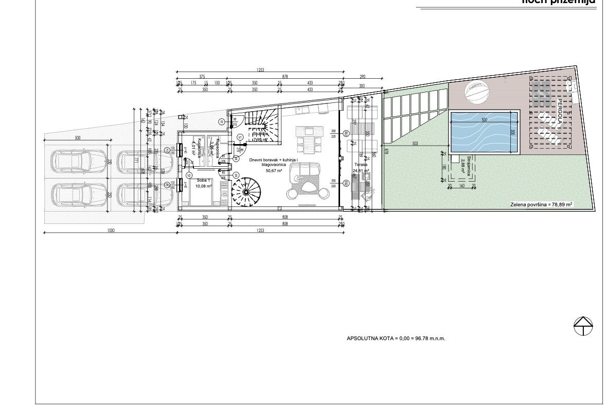 v pritličju: ena spalnica, ena kopalnica, kuhinja + jedilnica, dnevna soba