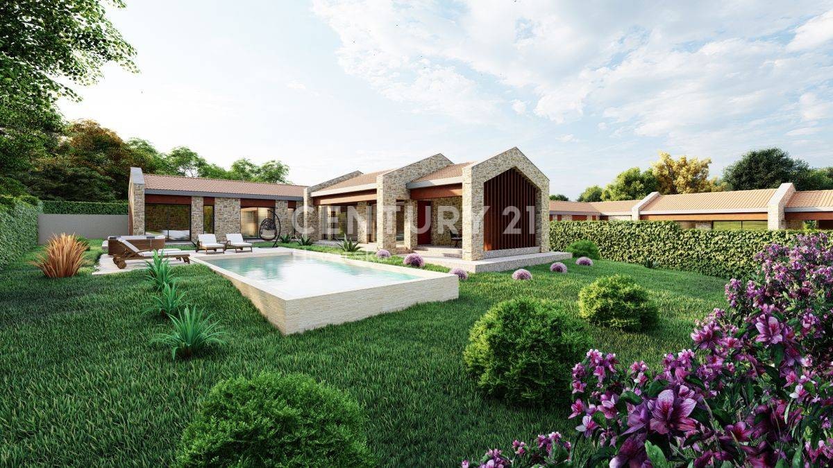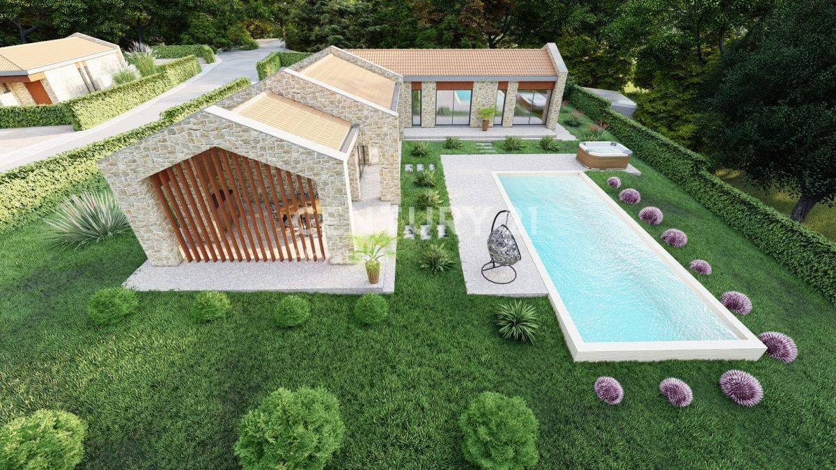 osredujemo pri prodaji 4 zemljišč za gradnjo nedaleč od Karojbe, v mirni naselbini, s projekti za gradnjo počitniških hiš s bazenom.