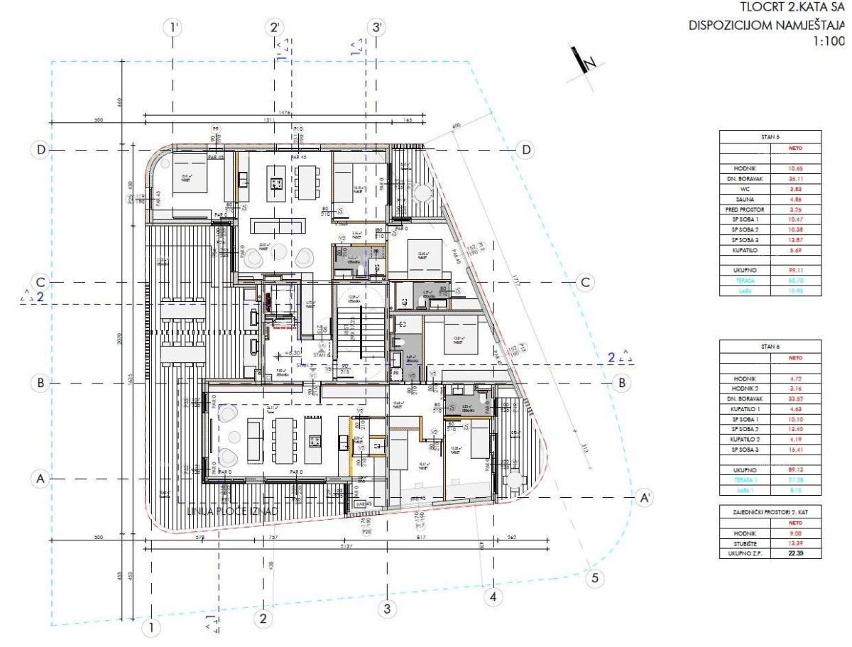 Stanovanje 6, površine 103,79 m2, se nahaja v 2. nadstropju stavbe in je sestavljeno iz hodnika, kuhinje in dnevne sobe, 3 spalnice, 2 kopalnice. Stanovanju pripada loža 8,10 m2 in terasa 27,28 m2 in pogled na morje.