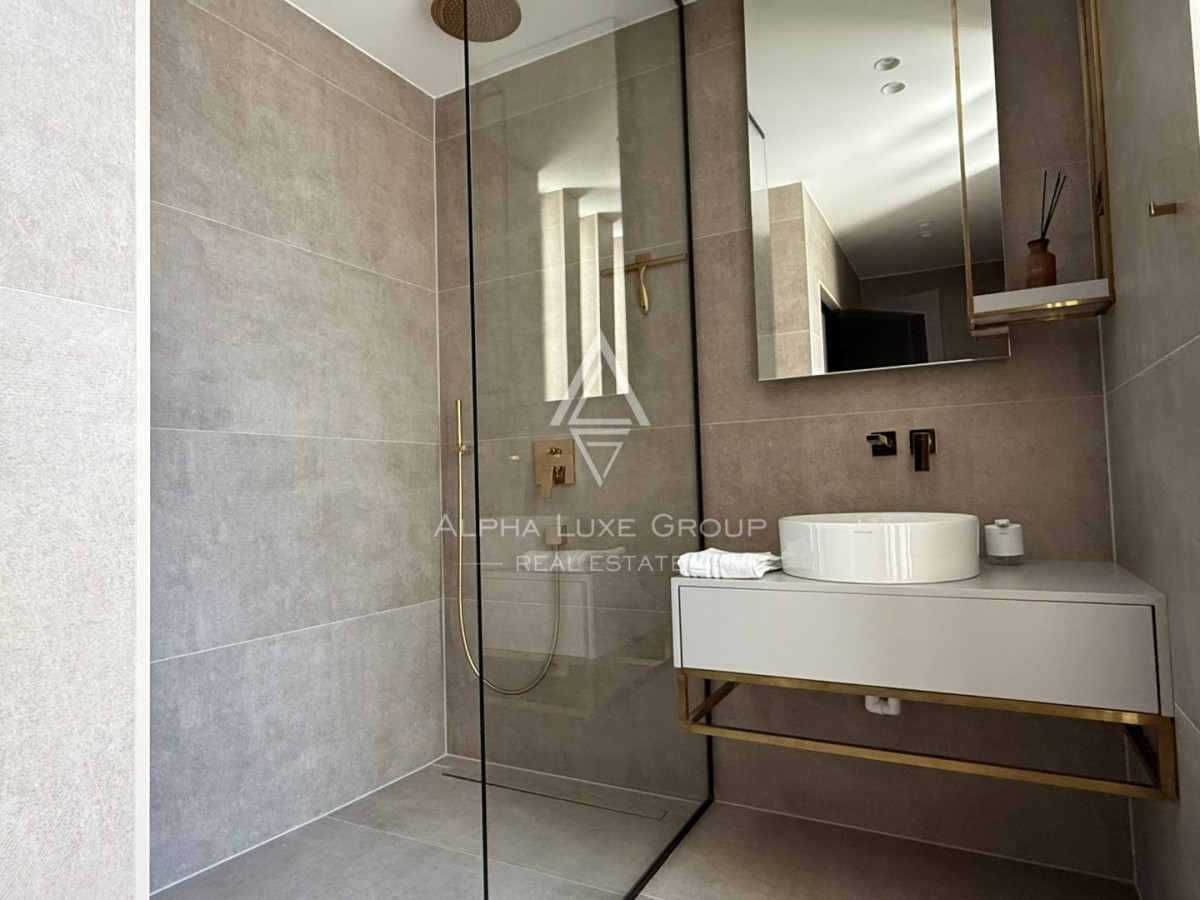 V zgornjem nadstropju so štiri prostorne spalnice, vsaka z lastno luksuzno kopalnico. Dve kopalnici imata črna steklena vrata, preostali dve pa drsna dizajnerska vrata iz lesenih panelov, ki so usklajena z vgradnimi omarami in stenskimi oblogami. Vse spalnice so opremljene z modernimi zakonskimi posteljami, televizorji, dizajnerskimi tapetami in pohištvom po meri.