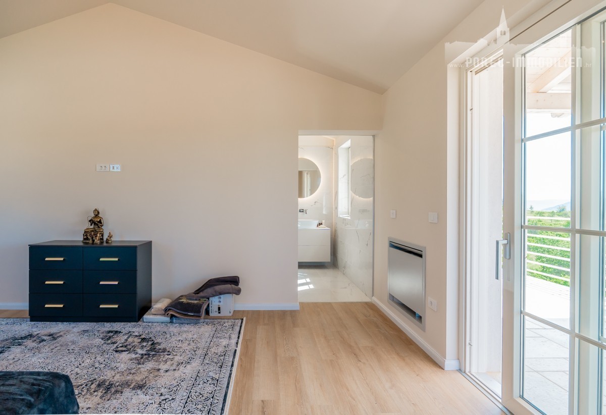 V nadstropju so tri velike spalnice, vsaka s svojo kopalnico in balkonom. Ogrevanje in hlajenje v hiši je zagotovljeno preko ventilatorskih konvektorjev.