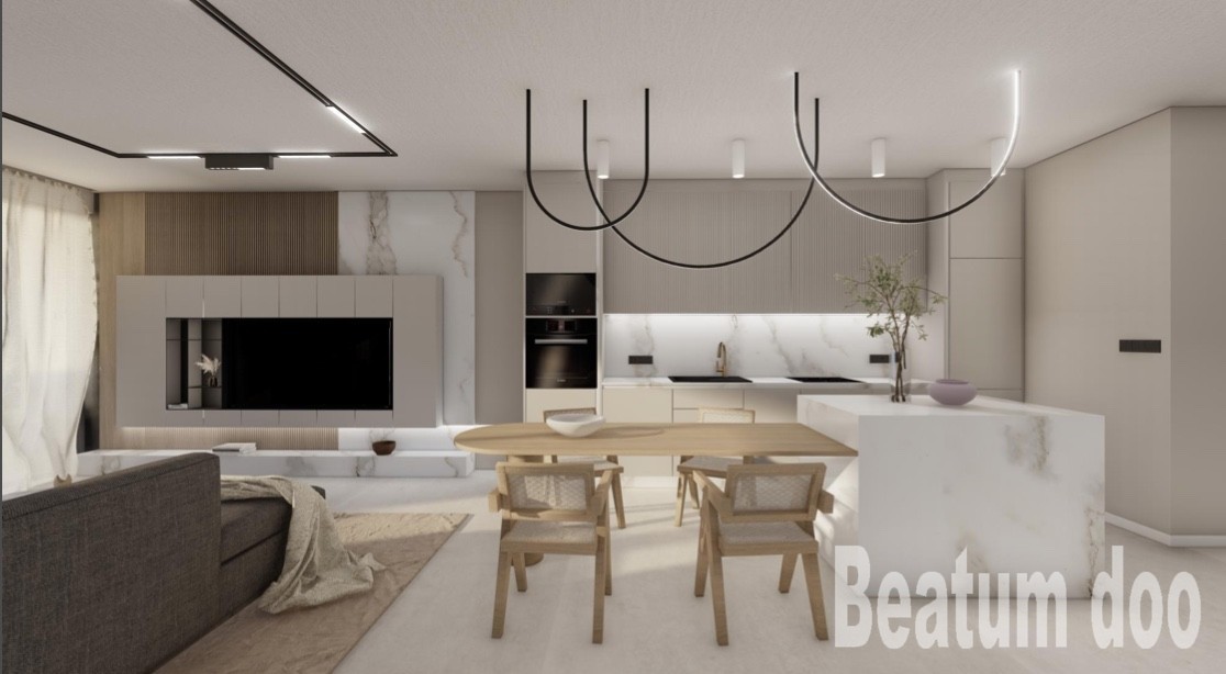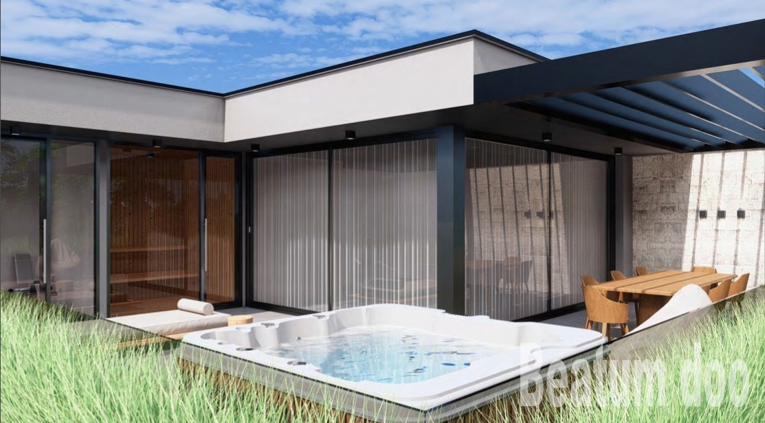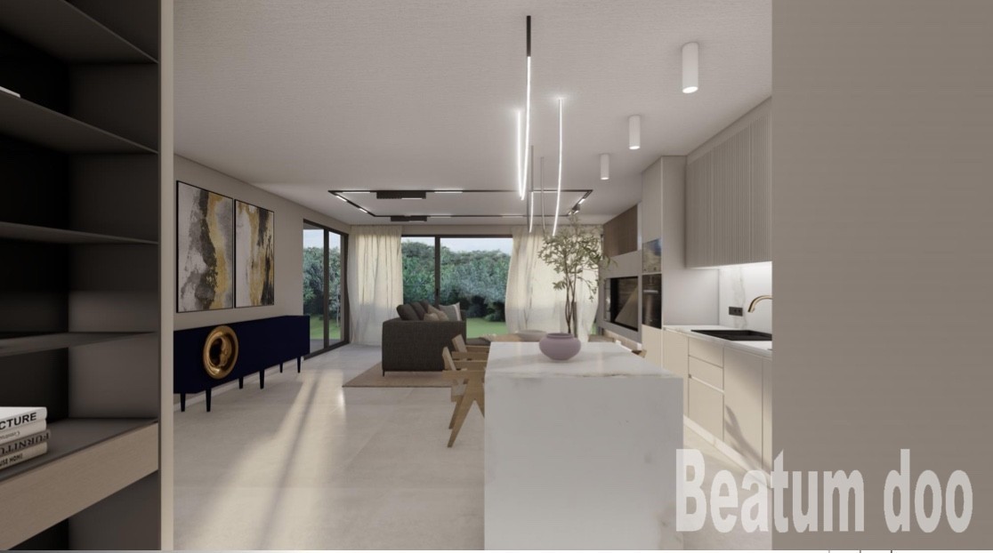 Kuhinja, dnevna soba, jedilnica, pokrita terasa, zunanja shramba.