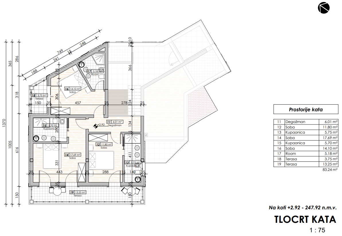 Medetaža je sestavljena iz: hodnika, spalnice ter kopalnice in wc-ja. Pritličje: kuhinja, jedilnica in dnevna soba v velikem odprtem prostoru z velikimi steklenimi stenami in v 1. nadstropju še tri spalnice, vsaka s svojo kopalnico in teraso.