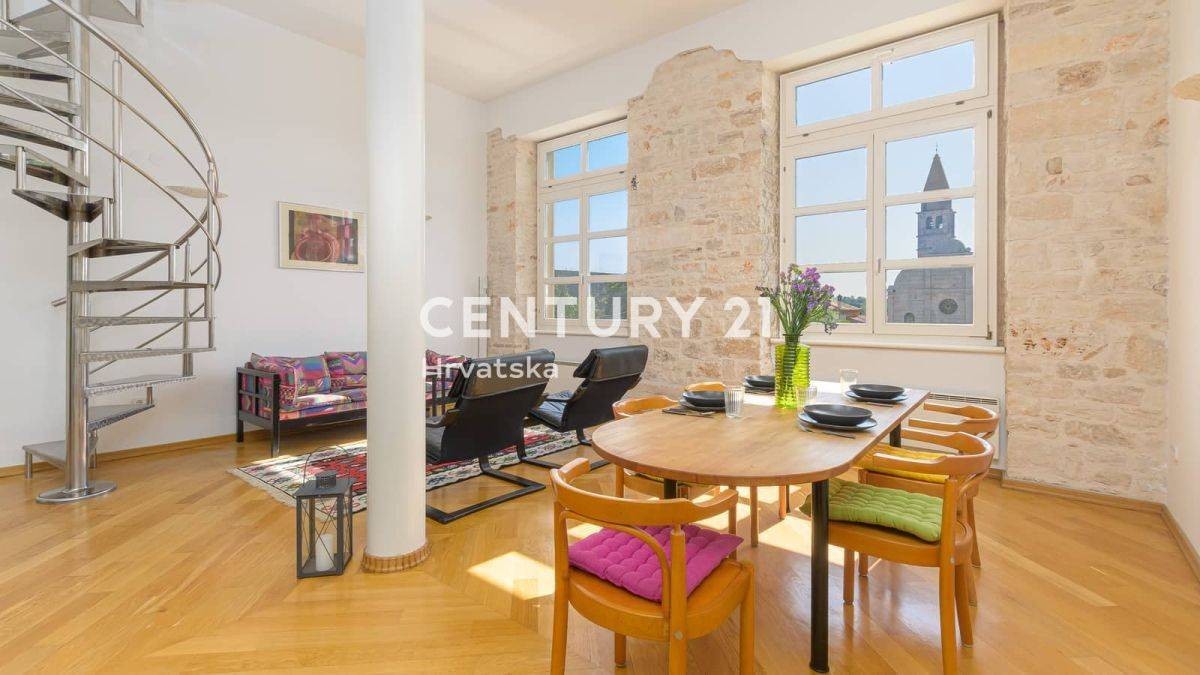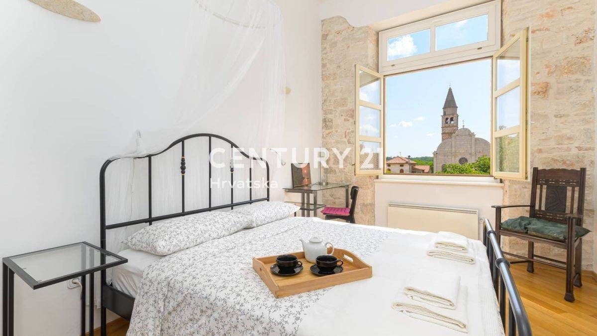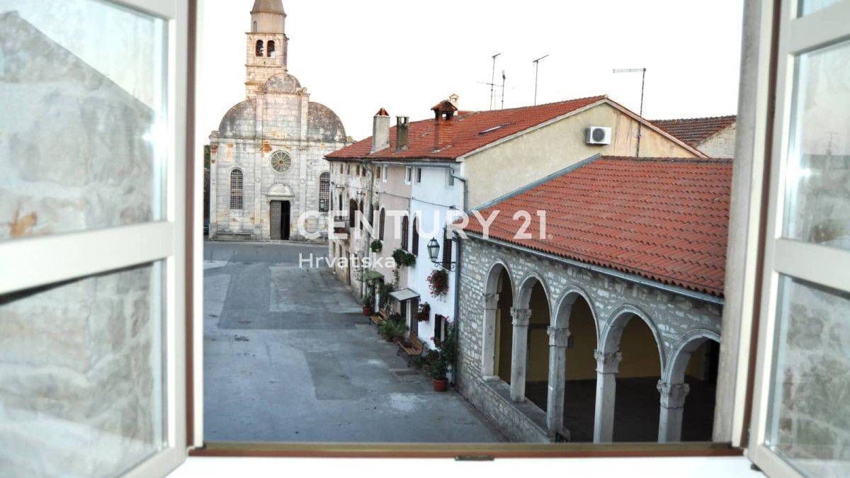 V srcu Svetvinčenta prodajamo prostorno stanovanje, ki iz vseh prostorij ponuja pogled na enega najbolj čudovitih trgov v Istri in grad Morosini-Grimani iz 15. stoletja, ter na teraso s pogledom na morje.