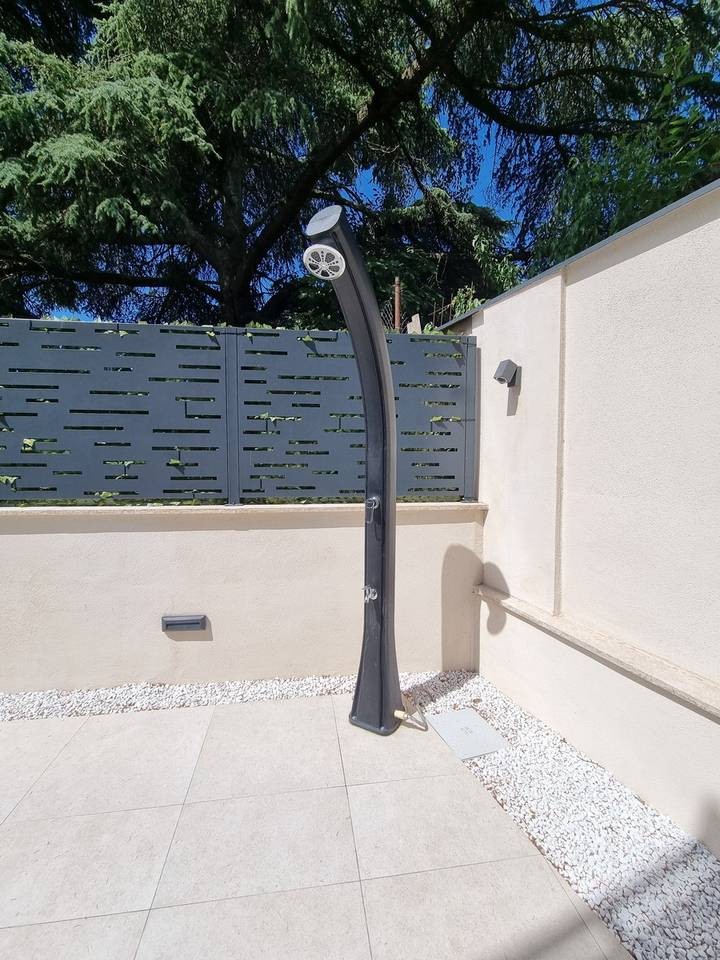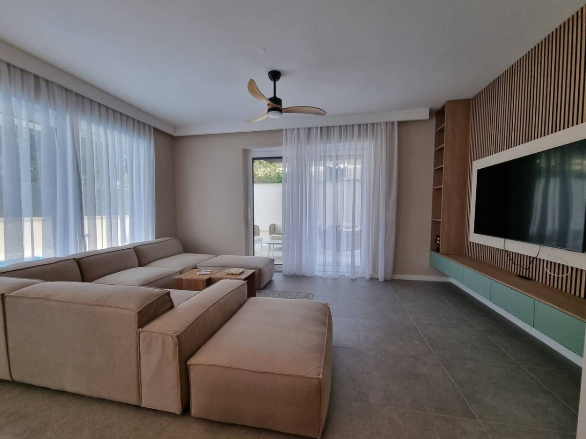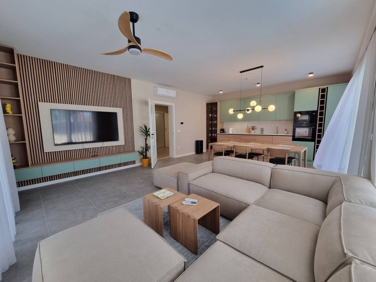 Sestavljeno je iz pritličja in 1. nadstropja. V pritličju so predsoba, pralnica, WC, kopalnica, spalnica, shramba, kuhinja, jedilnica in dnevna soba (open space 37,60 m2) ter pokrita terasa velikosti 12,90 m2. Z notranjim stopniščem se pride v nadstropje, kjer sta še dve spalnici z dvema kopalnicama, hodnik in skupni balkon velikosti 10,60 m2. Iz dnevnega prostora v pritličju je izhod v vrt velik 97 m2, kjer se nahaja bazen velik 17,50 m2, tuš ter urejeno in ograjeno dvorišče. Stanovanju pripadata tudi eno parkirno mesto velikosti 12,50 m2 in shramba velikosti 7,67 m2.