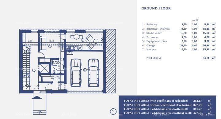 V pritličju vile se nahajajo: stopnišče, hodnik, studio soba, kopalnica, prostor za opremo, garaža, kuhinja.
