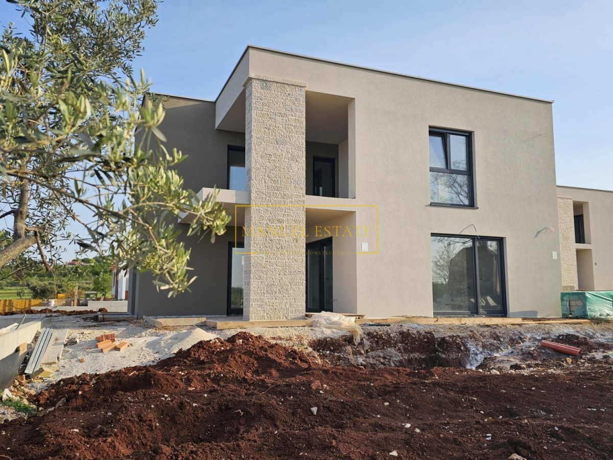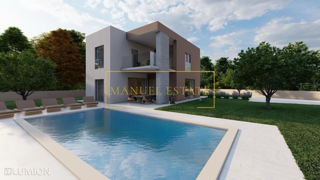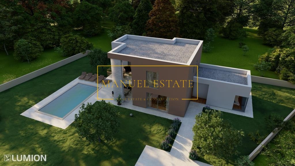 Moderna vila s pogledom na morje, ki se nahaja v bližini Poreča. Samostojna dvonadstropna hiša neto površine 145 m2, vrt 780 m2. Pritličje obsega dnevno sobo s kuhinjo in jedilnico, shrambo, tehnični prostor, WC in teraso 15 m2. V nadstropju so tri spalnice, tri kopalnice in terasa 19 m2. Središče skrbno urejenega vrta je 40 m2 velik bazen. Talno gretje na elektriko, hlajenje s klimo. Hiša se nahaja na mirni lokaciji, cca 8 km od morja.