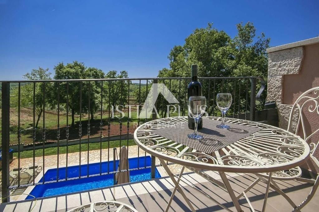 Hiša je bila zgrajena leta 2016 in se nahaja na zelo mirni legi, obdana s hrastovim gozdom in s pogledom na polja in oljčni nasad. Na urejenem in negovanem vrtu je tudi 24 m² velik bazen in whirlpool.