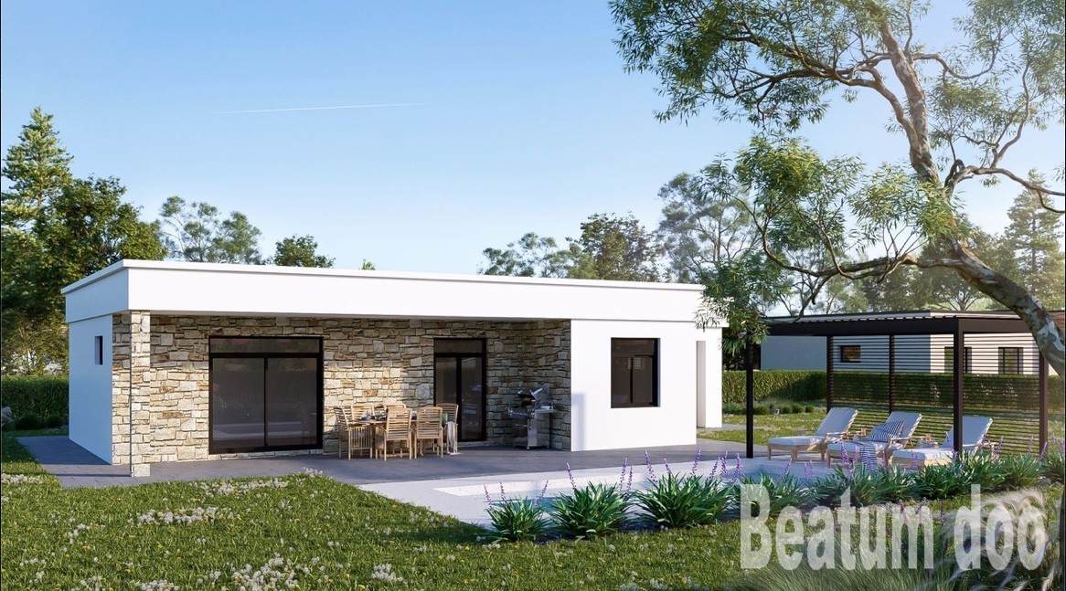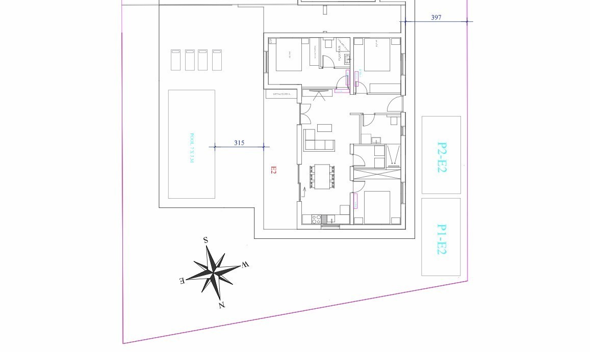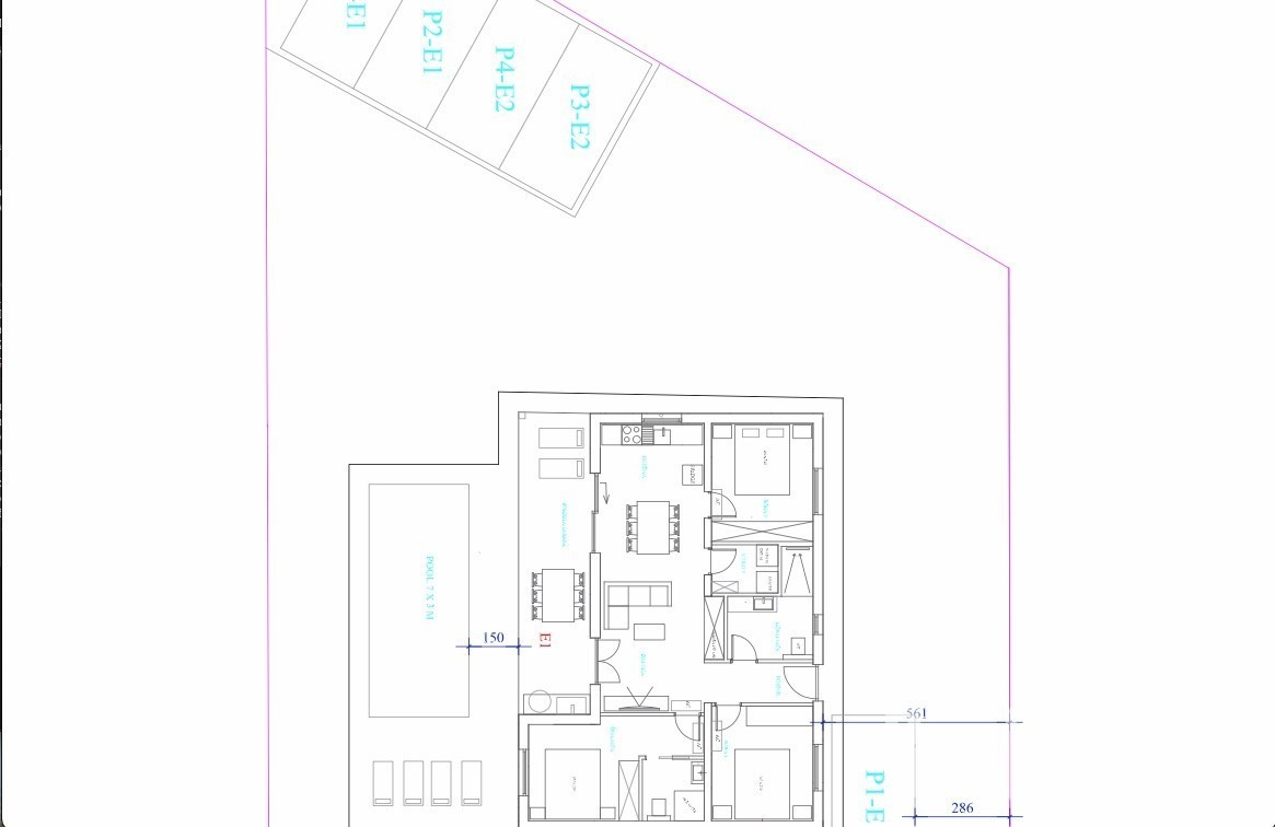 Moderna vrstna hiša, pritličje z bazenom Tri spalnice, dve kopalnici, 2 WC-ja, kuhinja, dnevna soba, jedilnica. Talno ogrevanje in klimatizacija po hiši, nameščene solarne instalacije.