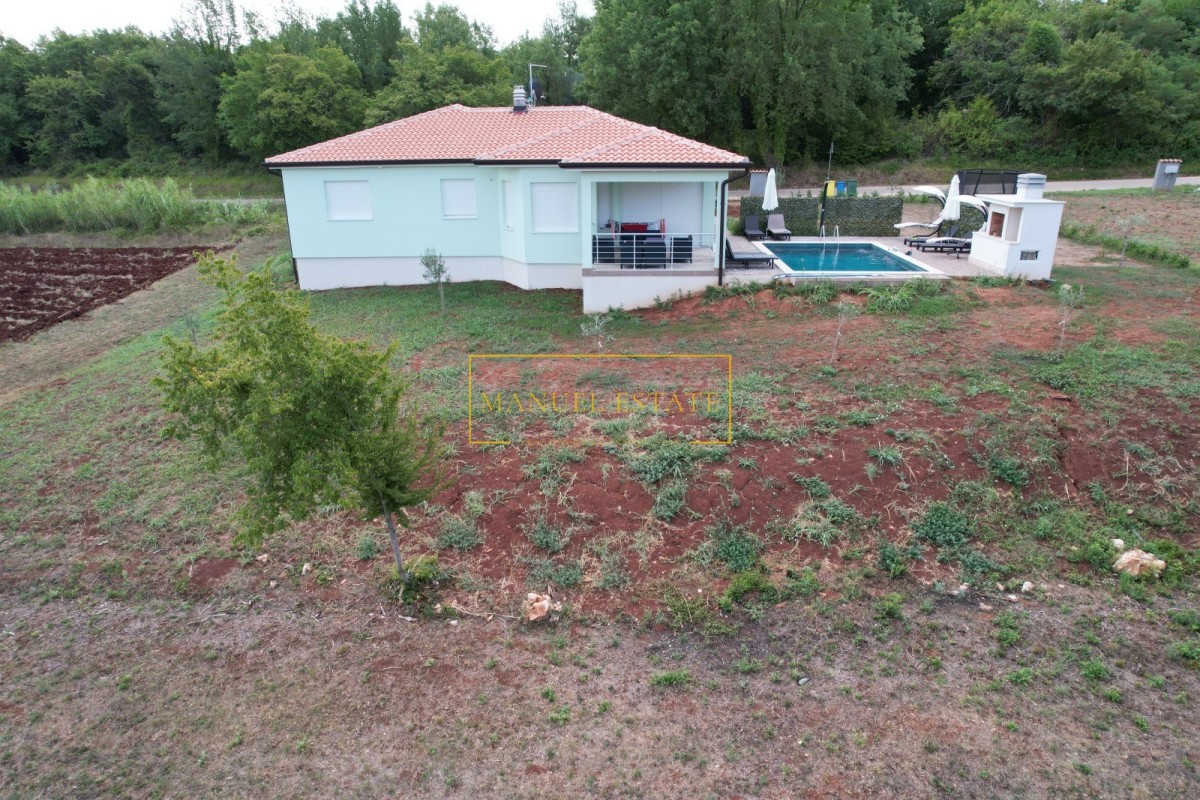 Hus med pool, nära Brtonigla, total boyta 140 m2 med en trädgård på 600 m2. Den består av en hall, ett kök, en matsal, tre sovrum, två badrum, ett förråd och ett vardagsrum med utgång till en täckt terrass med utsikt över poolen, trädgården och naturen. Toppmoderna luftkonditioneringsapparater är installerade. Trädgårdens centrum på 600 m2 består av en pool med en solterrass, en öppen spis/grill och planterade unga olivträd. Det finns möjlighet att uppgradera sommarköket och altanen. Det finns även två utomhusparkeringsplatser på gården. Huset byggdes 2020, det ligger i ett lugnt läge, ca 1 km från centrum av Brtonigla, och ca 5 km från havet och välskötta stränder. Umag ligger 7 km bort och Novigrad ligger 8 km bort. För all annan information, kontakta oss gärna.
