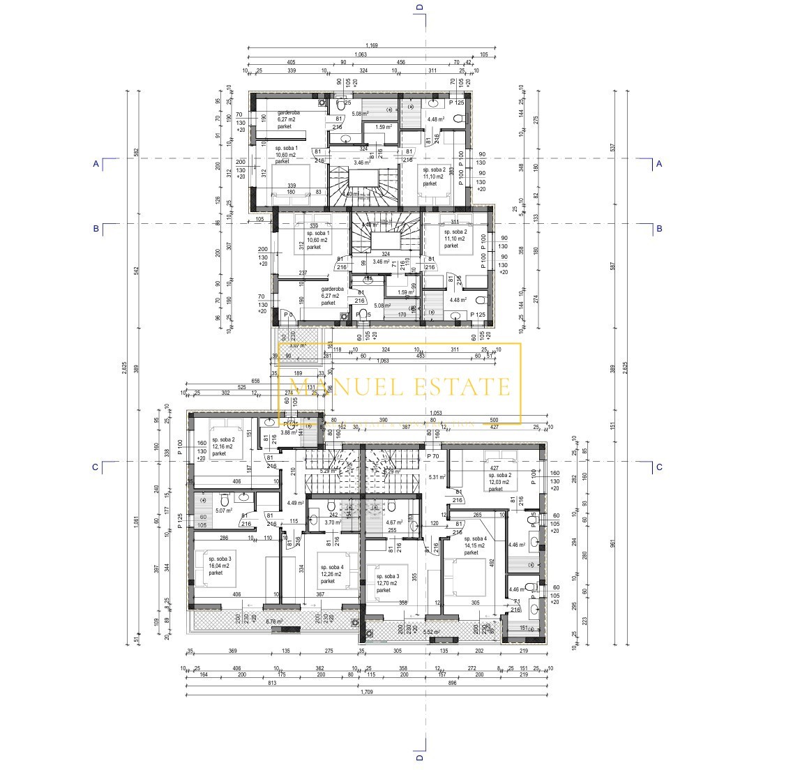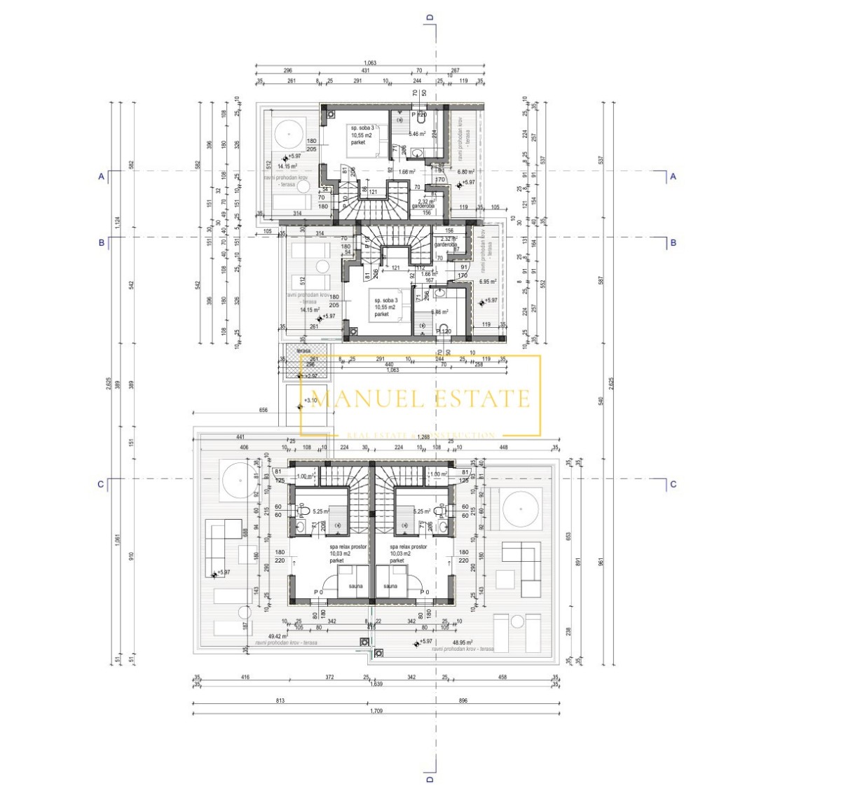 En inre trappa leder upp till första våningen, där det finns tre rymliga sovrum, var och en med eget badrum. Två av sovrummen har tillgång till en loggia, en perfekt plats för att njuta av morgonkaffet och koppla av. På den översta våningen, på vinden, finns ett spa-område, ytterligare ett badrum, ett förråd och en öppen takterrass på 48,95 m², perfekt för utomhusvistelse.